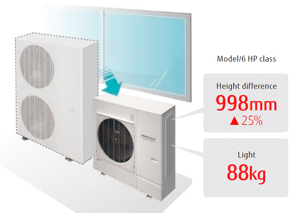 Les unités extérieures de cette série sont beaucoup plus compactes que les unités extérieures classiques d'une capacité comparable. Elles peuvent être installées sur un balcon, sans dépasser la hauteur du garde-corps. D'une hauteur inférieure à 1 m, elles peuvent être installées dans des espaces restreints, sous une fenêtre par exemple.