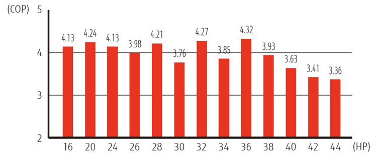 L'association de notre structure d'échangeur de chaleur exclusive et de nos doubles compresseurs rotatifs CC hautement efficaces permet d'obtenir le meilleur coefficient de performance (COP) avec chaque version.