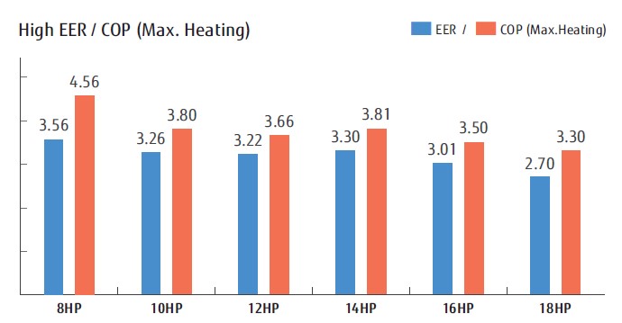 Alle modellen hebben een zeer hoge EER/COP (max. verwarming) dankzij de grote warmtewisselaar en een zeer efficiënte scrollcompressor.