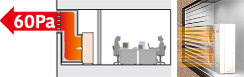 Zelfs als het buitendeel in een kleine ruimte is geïnstalleerd om deze te verbergen, kunnen het rooster en het luchtkanaalpad die nodig zijn voor de uitblaaslucht worden geïnstalleerd tot een statische drukwaarde van 60 Pa. (40 Pa voor 8/10/12HP)