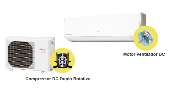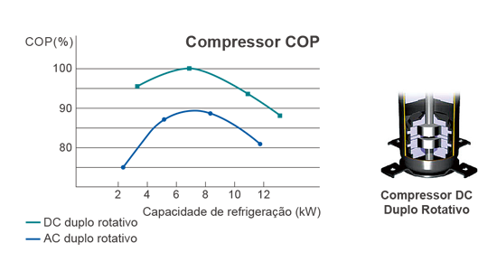 A alta eficiência é obtida através do uso do compressor DC duplo rotativo, controle DC inverter e motor DC do ventilador.