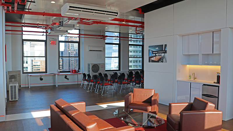 L’AIRSTAGE du Centre de solutions de GENERAL Inc. a été élaboré et conçu comme un « centre d’apprentissage et de partage » où architectes, ingénieurs, propriétaires immobiliers, entrepreneurs, consultants en énergie et clients acheteurs de systèmes de CVCA peuvent se réunir pour collaborer et faire part de leurs expériences… avec une vue imprenable sur Times Square et Manhattan en arrière-plan.
