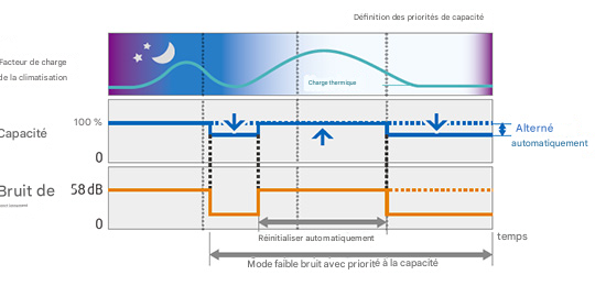 Deux modes discrets possibles : le mode discret dans lequel le silence est prioritaire sur les performances et le mode discret dans lequel les performances sont prioritaires sur le silence, en fonction de la température ambiante et de la température extérieure. Cette fonction peut être contrôlée par une entrée externe provenant de l'unité extérieure ou de System Controller.