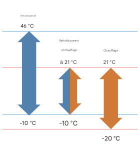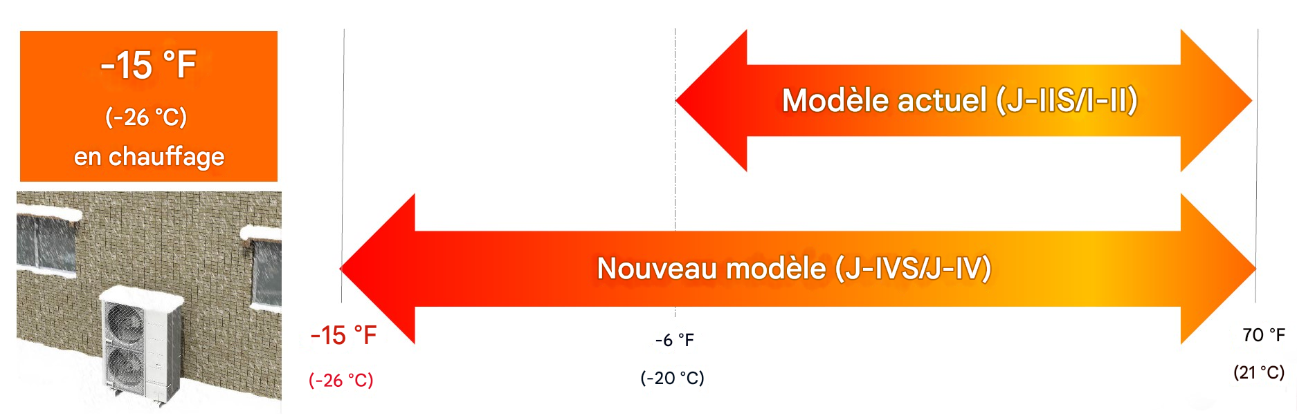 Correspond à un fonctionnement en mode chauffage à une température extérieure de -26 °C (-15 °F). Produit idéal pour les zones froides auxquels les produits classiques ne sont pas adaptés.