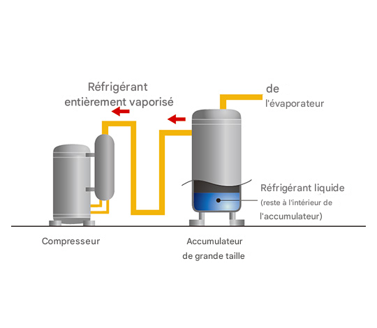 Un gros accumulateur capte le fluide frigorigène non encore vaporisé pour empêcher le fluide frigorigène liquide de pénétrer dans le compresseur.