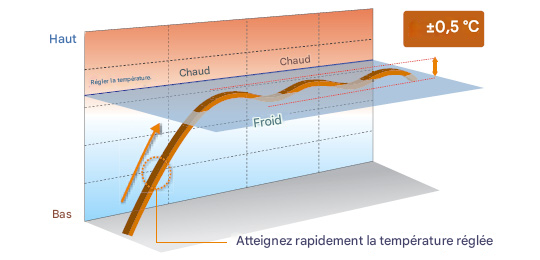 L'association de l'onduleur CC et de la commande individuelle des détendeurs électroniques d'une unité intérieure permet un contrôle précis et régulier du débit de fluide frigorigène. Cela permet d'augmenter ou de diminuer la température ambiante par incréments de 0,5 °C.