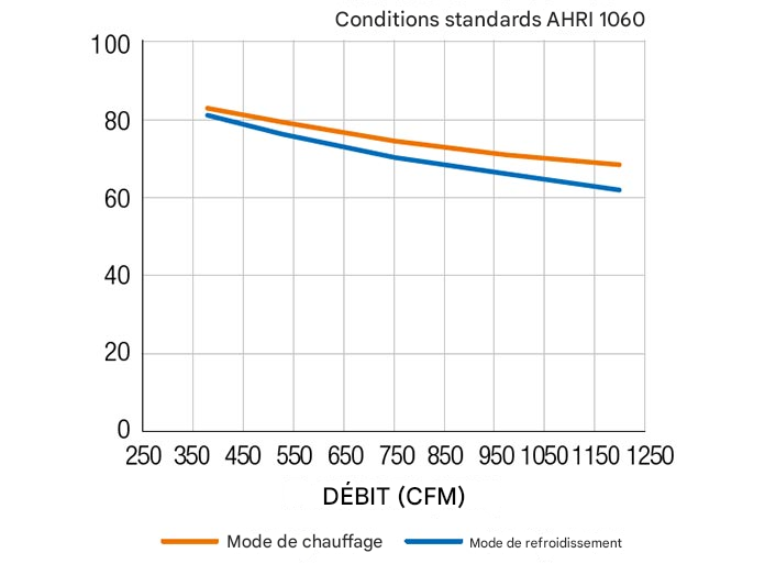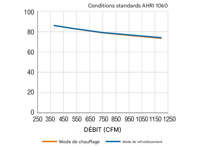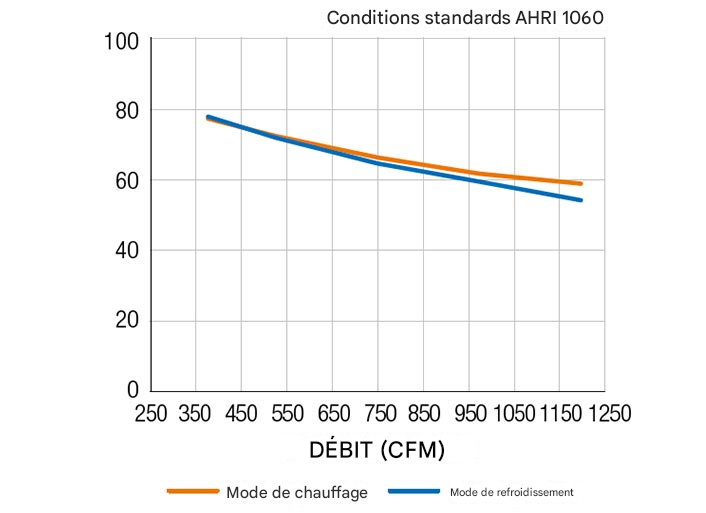 | Pression statique externe (po H2O) | 0,28 | 0,86 | 1,40 | 1,88 | 2,31 |