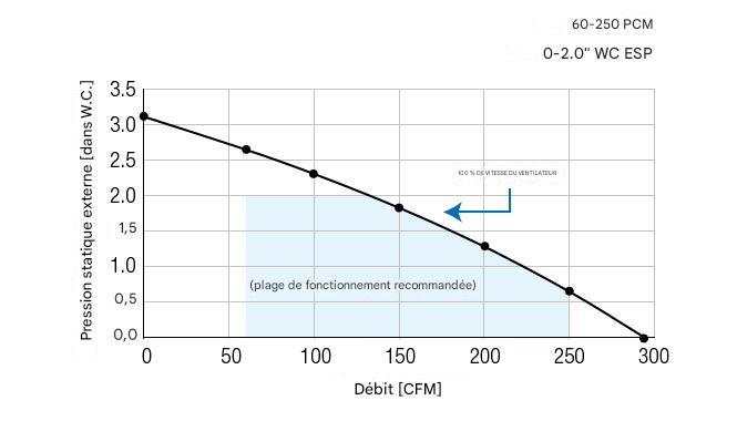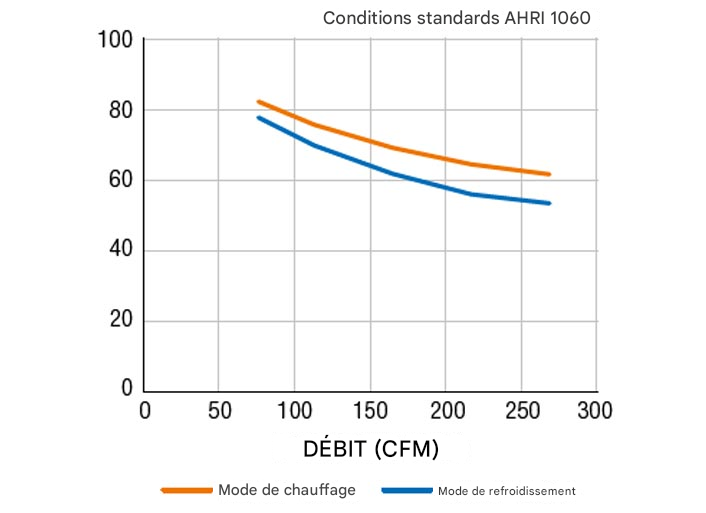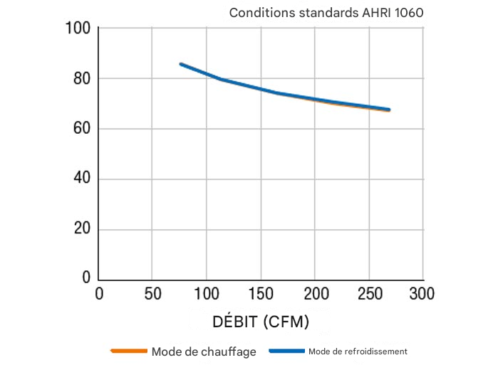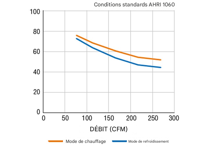 | Pression statique externe (po H2O) | 0,67 | 1,30 | 1,85 | 2,33 | 2,67 |