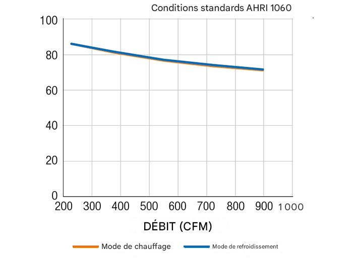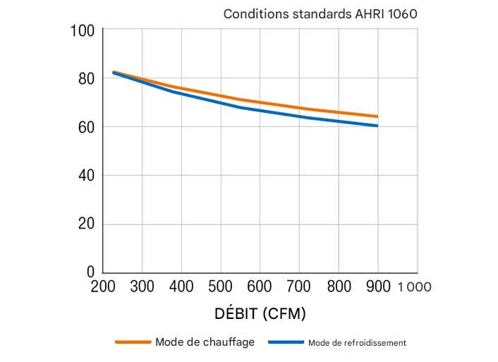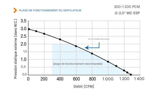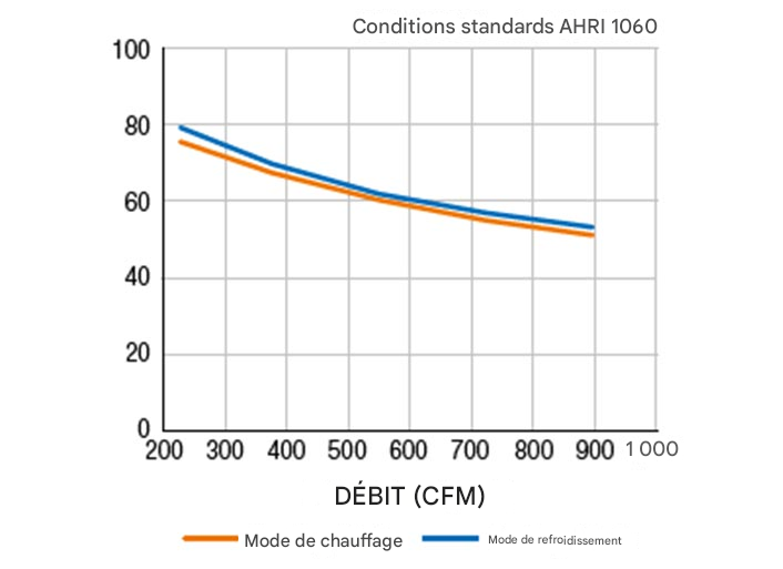 | Pression statique externe (po H2O) | 0,28 | 0,86 | 1,40 | 1,88 | 2,31 |