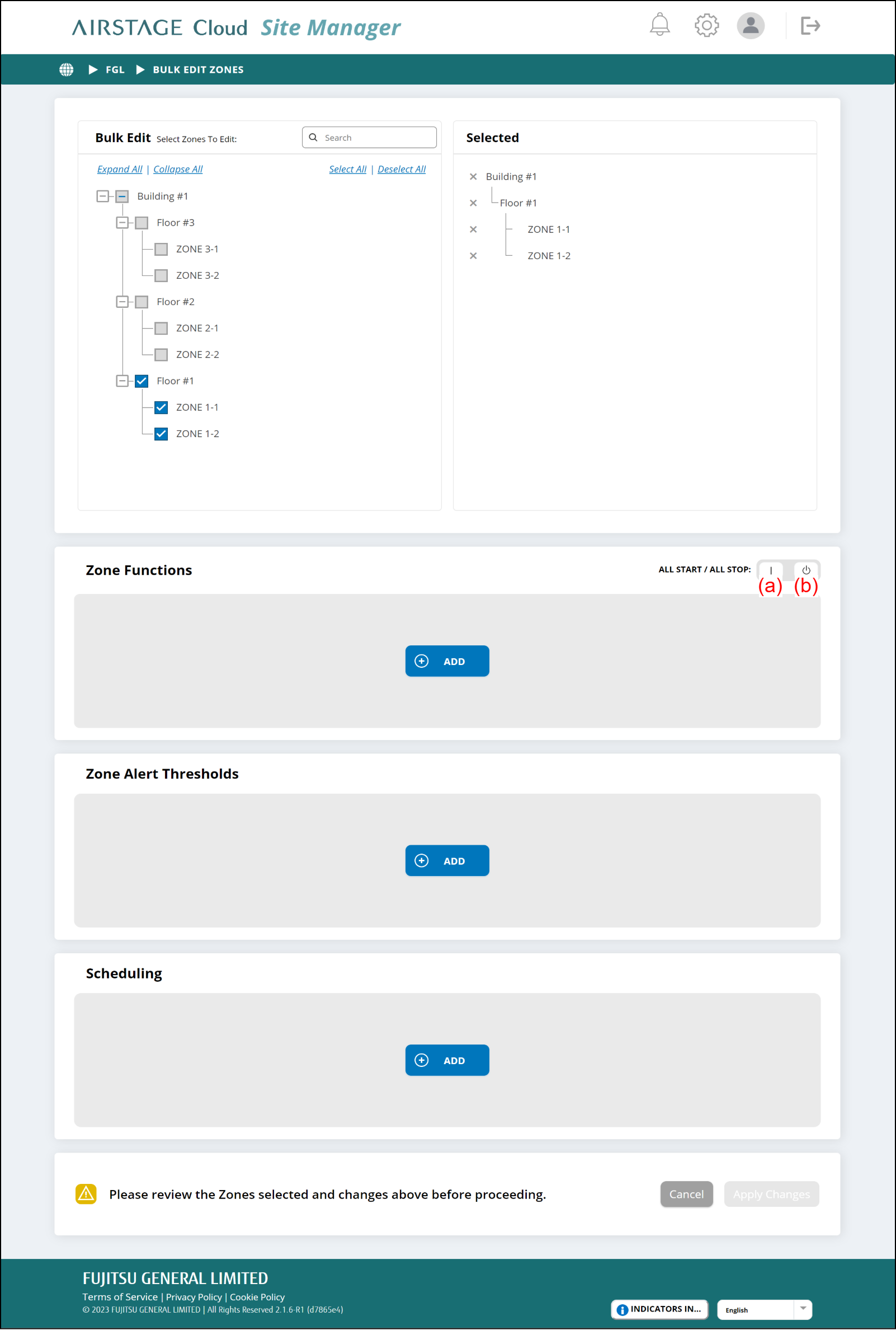 لإيقاف تشغيل جميع الوحدات الداخلية في المناطق التي تم اختيارها، قم باختيار الزر [ALL STOP] (b).