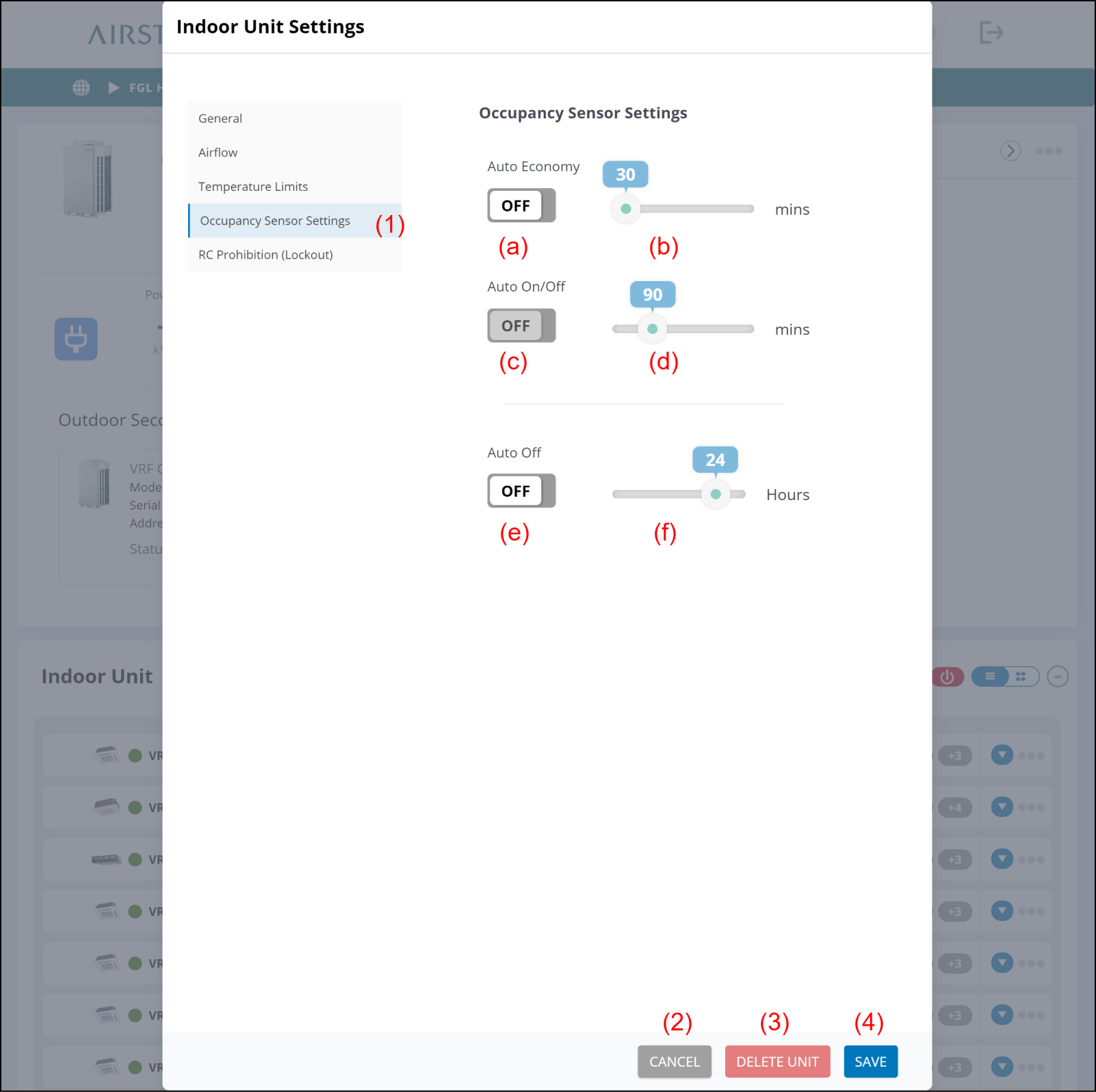 النافذة "Indoor Unit Settings" (Occupancy Sensor Settings)