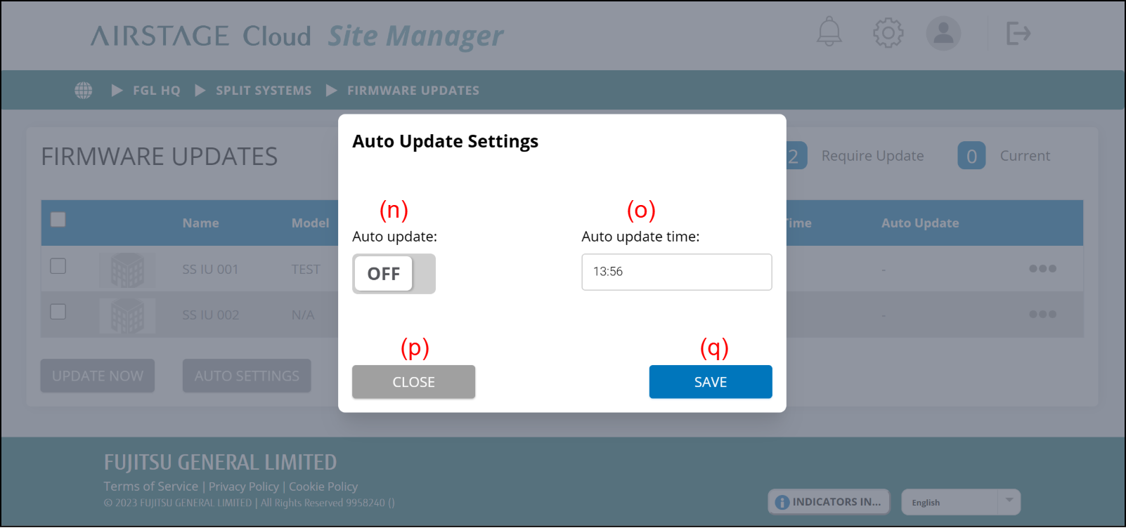 - قم بإعداد "Auto Update Time" (o) على الوقت الذي تريد إجراء التحديث التلقائي فيه. نظرًا لعدم إمكانية استخدام وظيفة مكيف الهواء أثناء التحديث، قم بإعداد وقت التحديث على الوقت الذي لا يتم فيه استخدام مكيف الهواء.