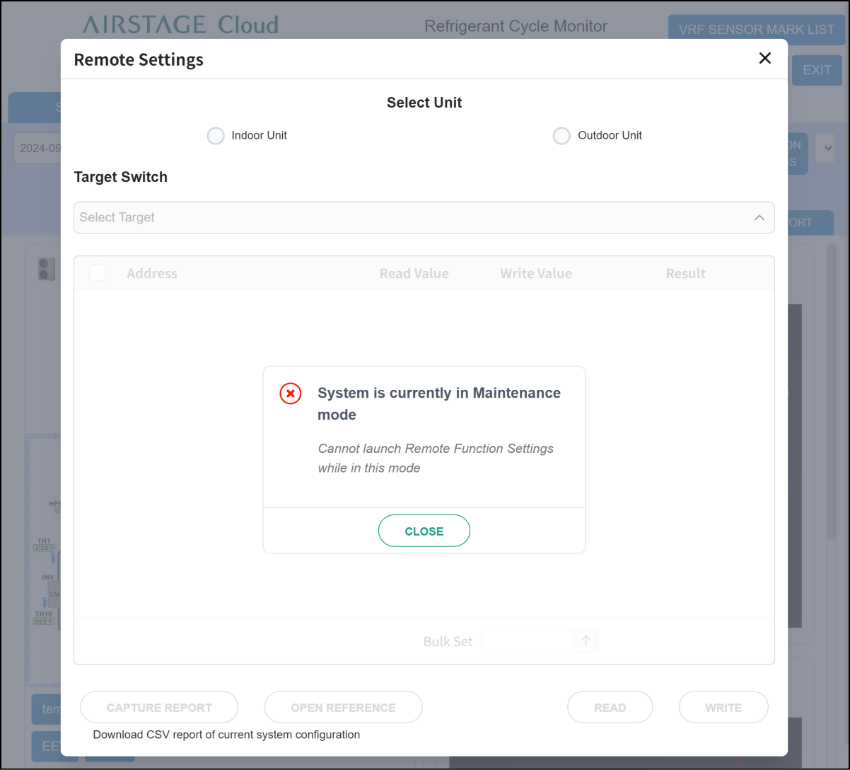 - انقر على الزر “REMOTE SETTINGS” على الشاشة “Refrigerant Cycle Monitor”.