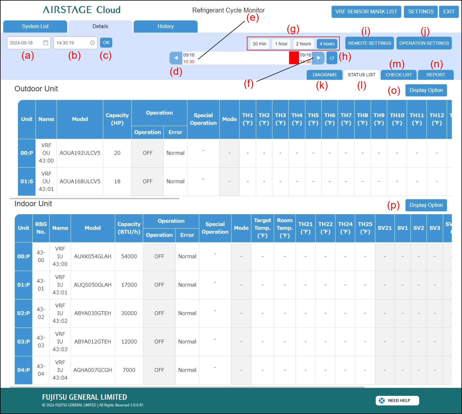 In this screen, detail data for all the units in the specified refrigerant system will be displayed at a certain point of time.