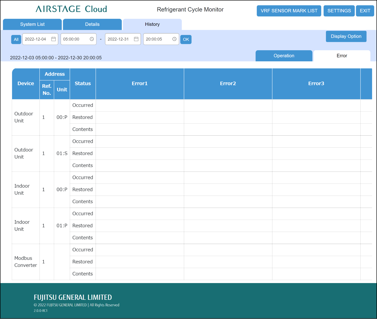| Error 1 ~ 50 | Displays the error acquisition time and error contents. Displays currently generated errors in red. -"Occurred": Displays the date and time when an error occurs. -"Restored": Displays the date and time when an error is solved, and the unit is restored to its original state. -"Contents": Displays the error contents. |