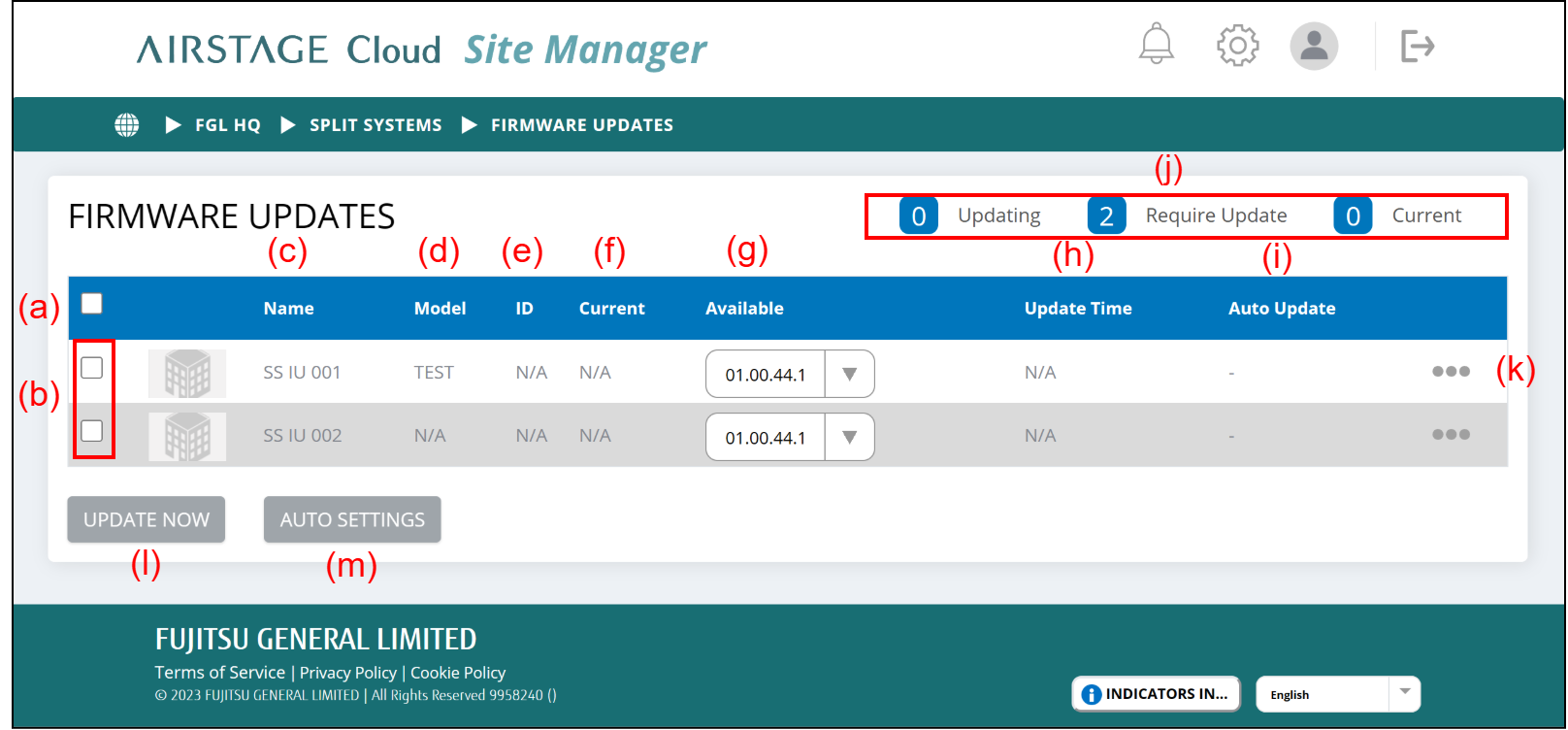This screen is displayed when the [UPDATES] button in FIRMWARE is selected on the Split Systems screen.