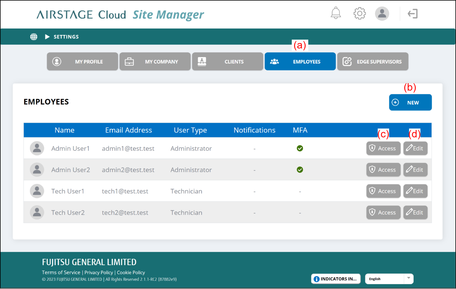Refer to "Set access grant to employee" for details.To edit the employee's information or delete the employee, select the button (d).