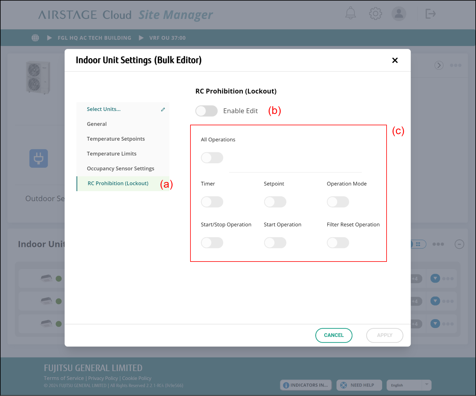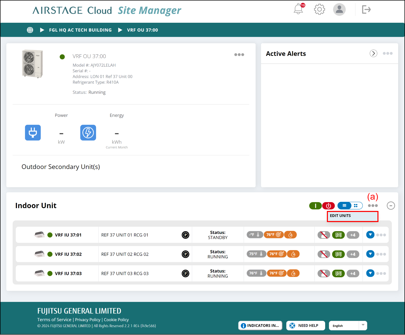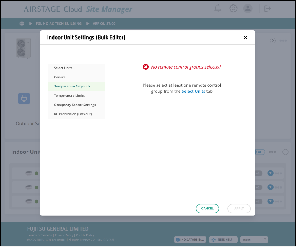 Bulk setting changes for indoor units in this refrigerant system can be performed on the VRF Dashboard screen.