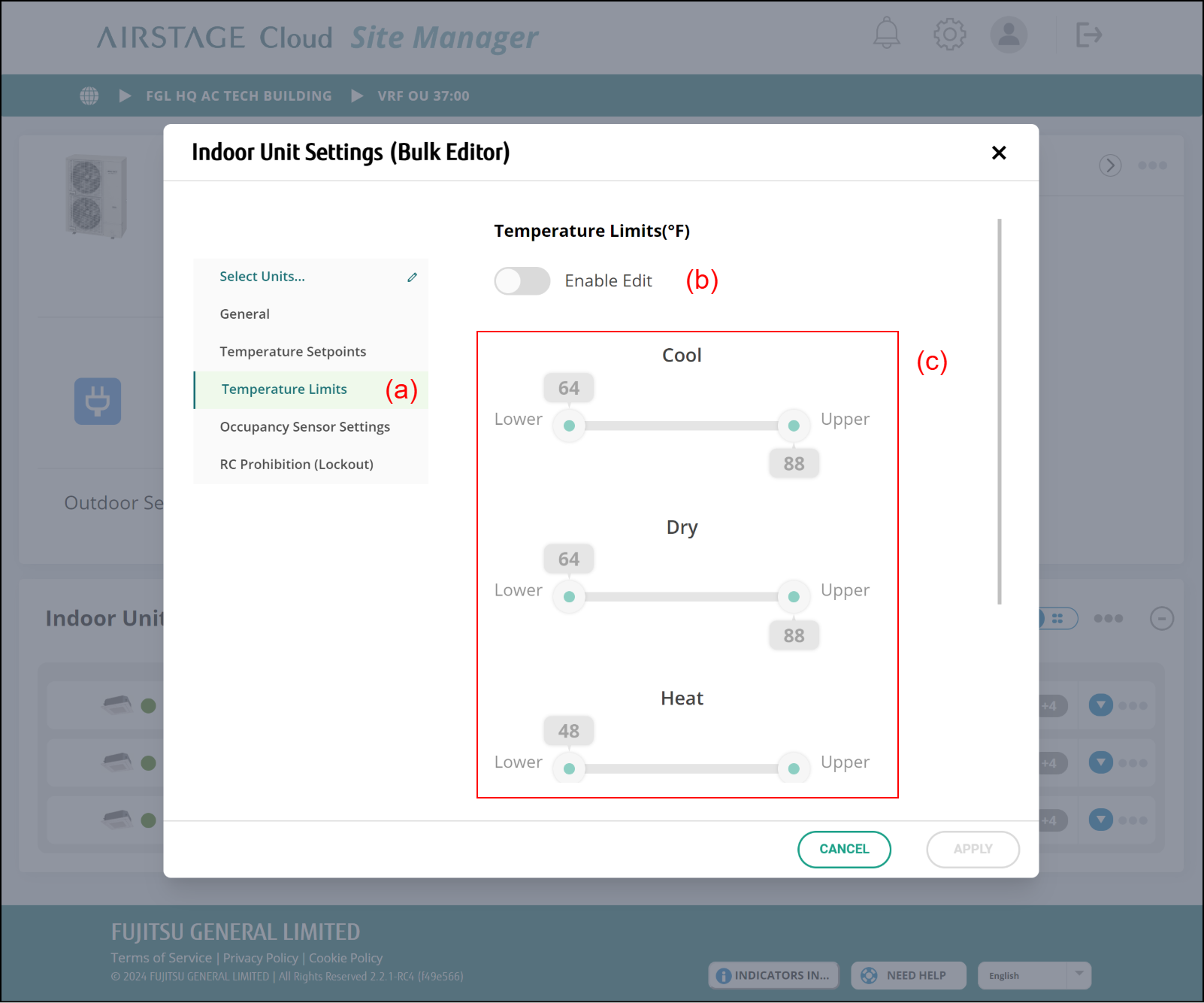 Sets the limit values of each operation mode. Items of Temperature Limits at Auto change depending on the function information of selected indoor unit.