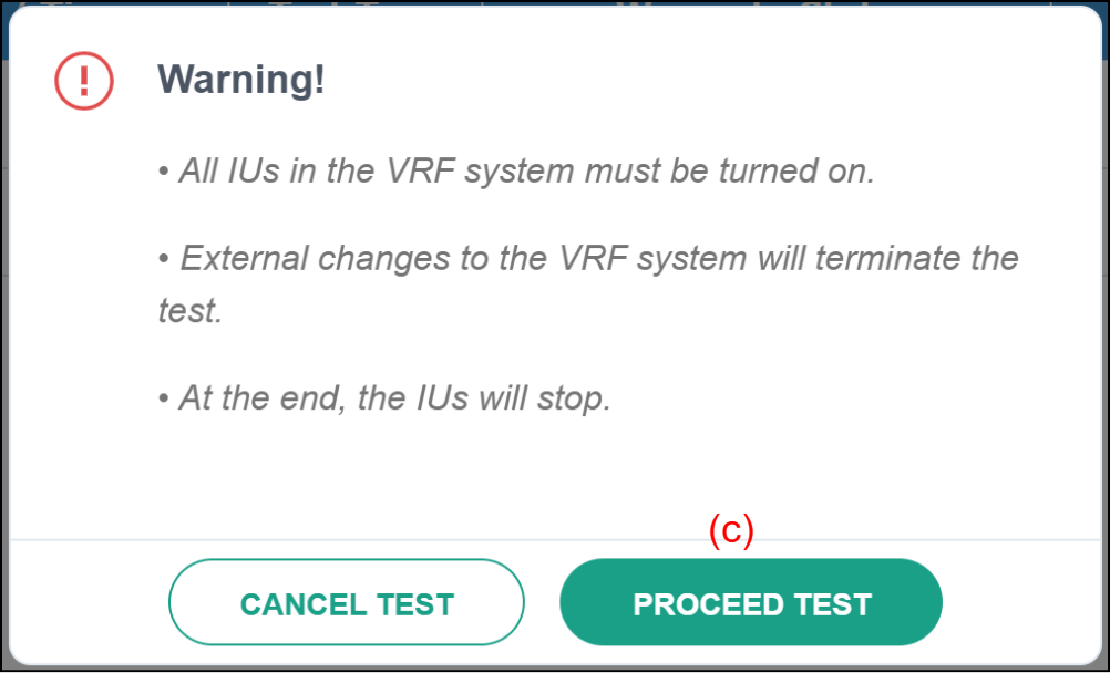 Displays a pop-up by tapping this button. When [PROCEED TEST] is tapped, the test starts in the selected test mode.