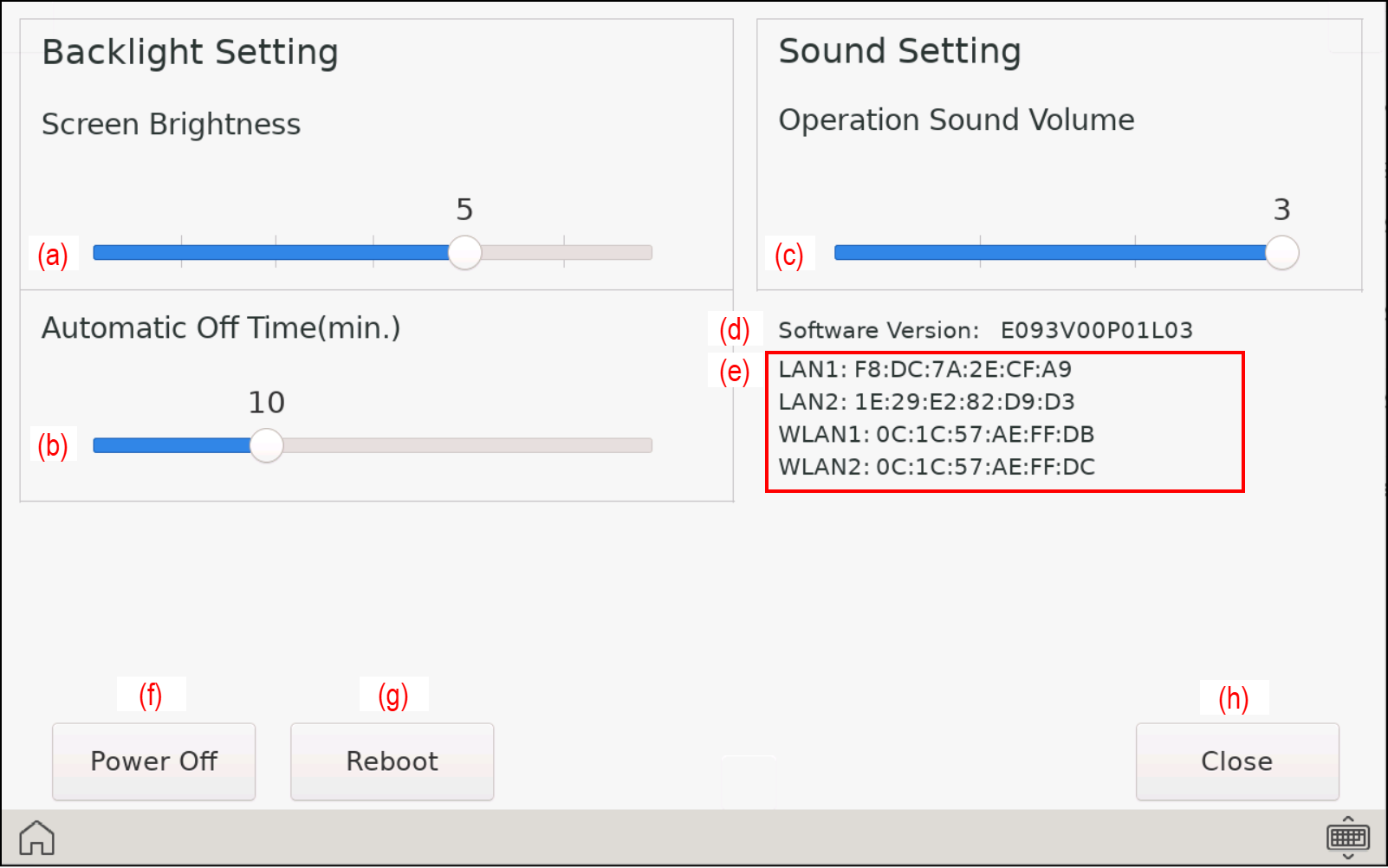 Para apagar el AIRSTAGE Edge Controller, toque el botón [Power Off] (f).