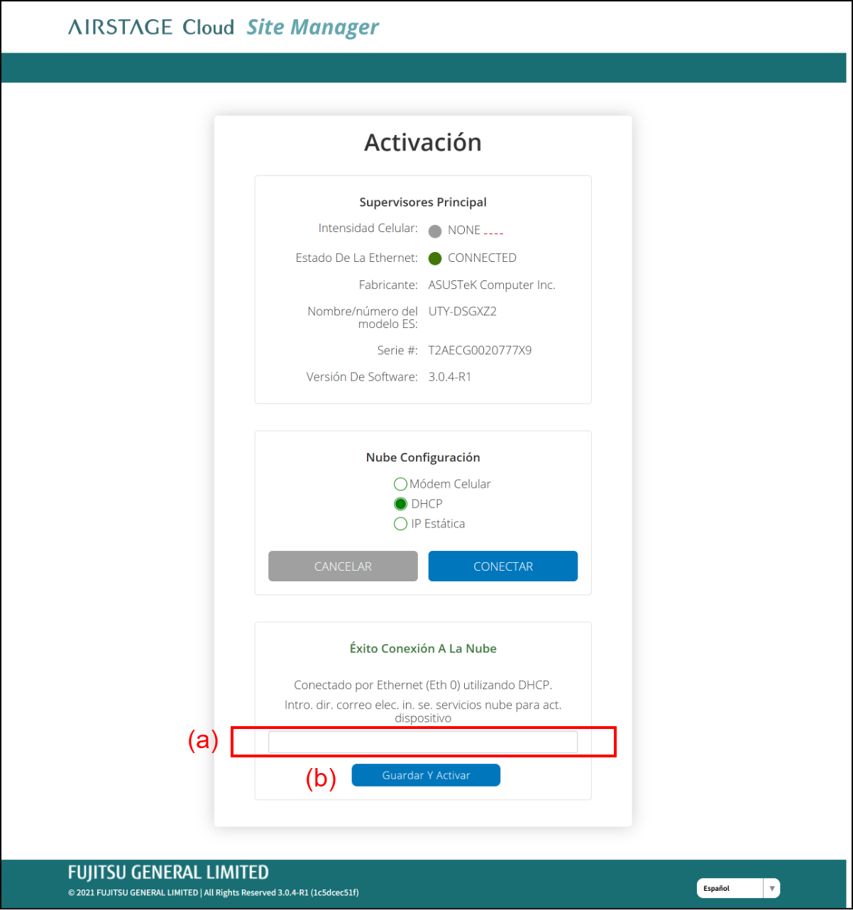 Se debe registrar esta dirección de correo electrónico como cuenta de AIRSTAGE Cloud Site Manager y tener autoridad de Administrador o Técnico.Toque el botón (b).