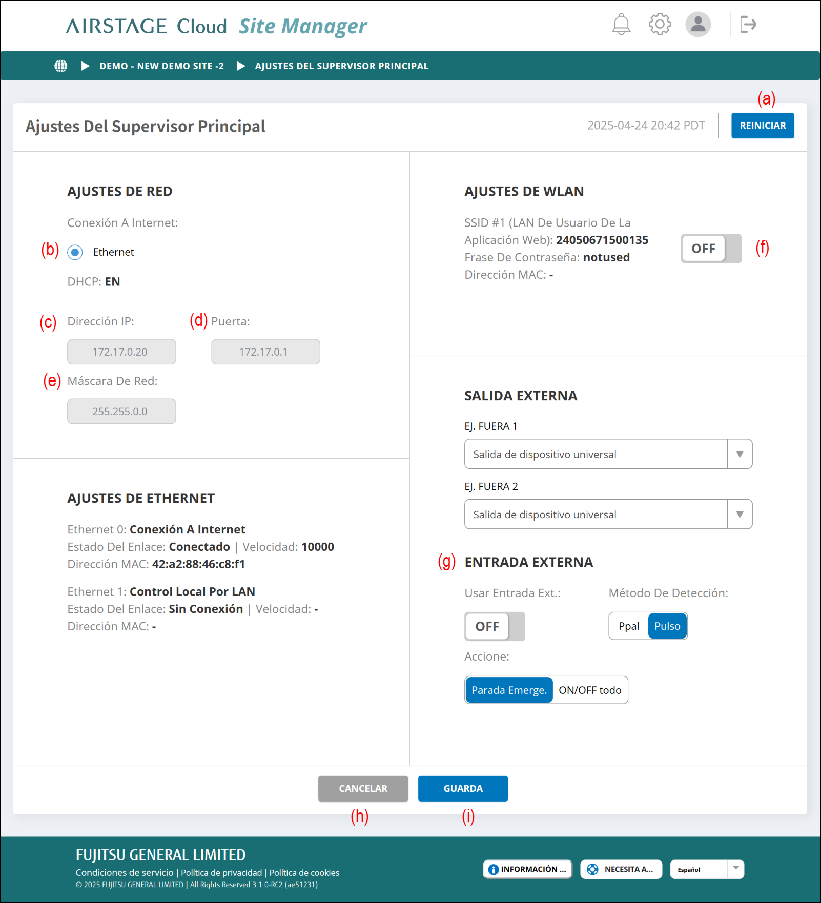 (f) Se muestran los ajustes de la red de AIRSTAGE Cloud Edge Supervisor. (Compatible en el future)