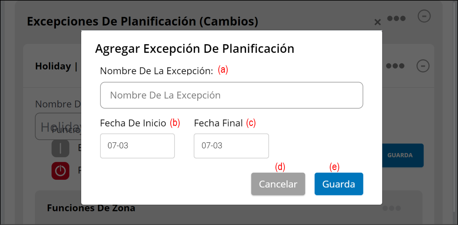 (d) Se muestra el ajuste del nombre y período de la excepción.