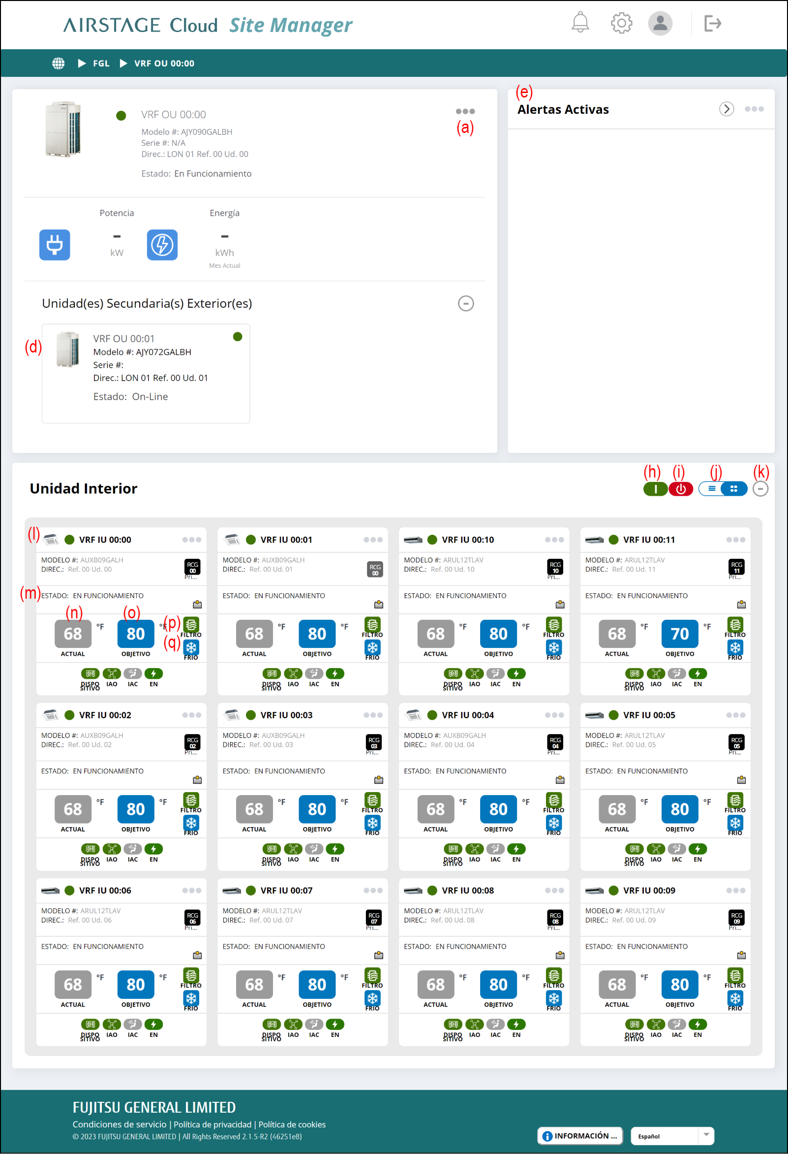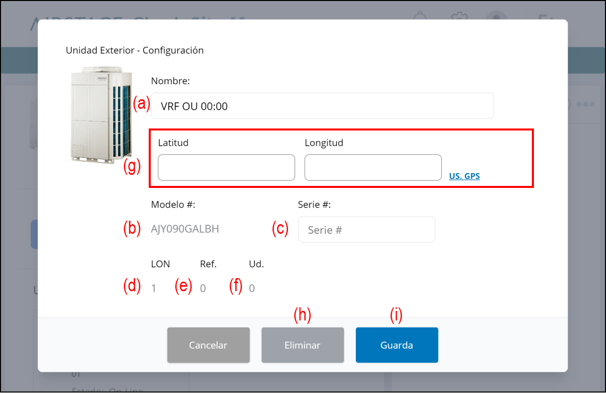 Después de ajustar las coordenadas, se mostrará la ubicación de la unidad exterior en el mapa de la pantalla “Panel de control del sitio”.