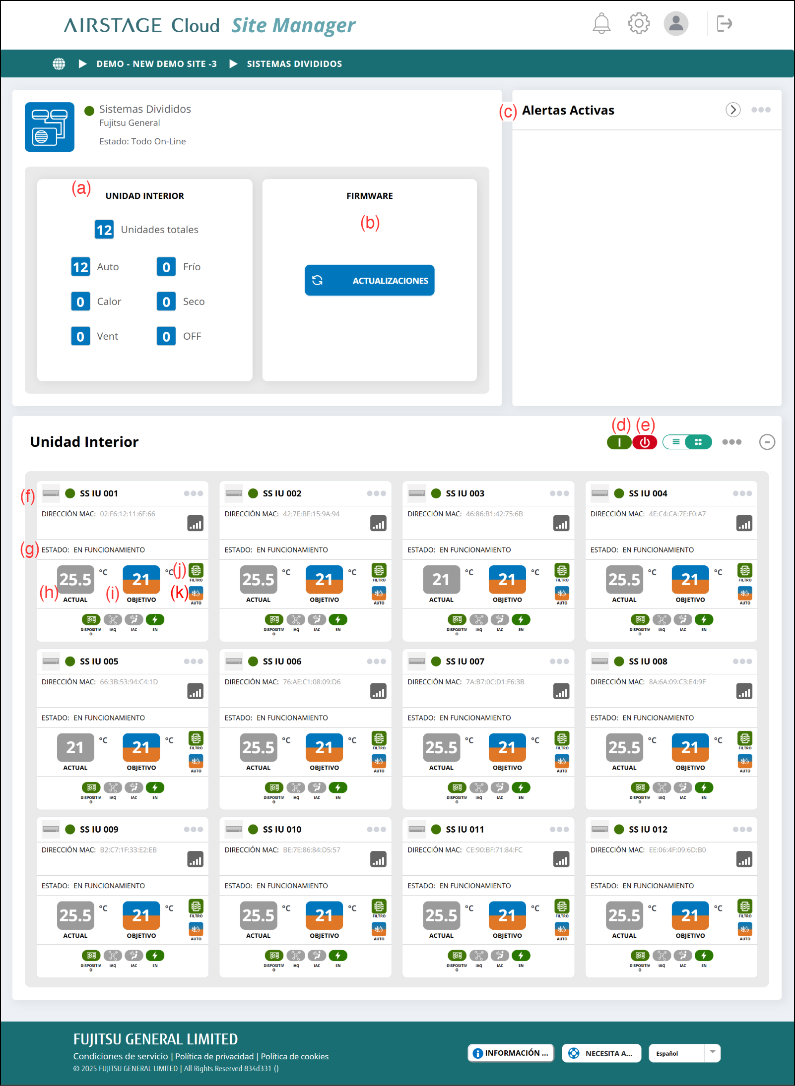 (a) Muestra el número de unidades interiores de Sistema dividido registradas y su estado de funcionamiento.