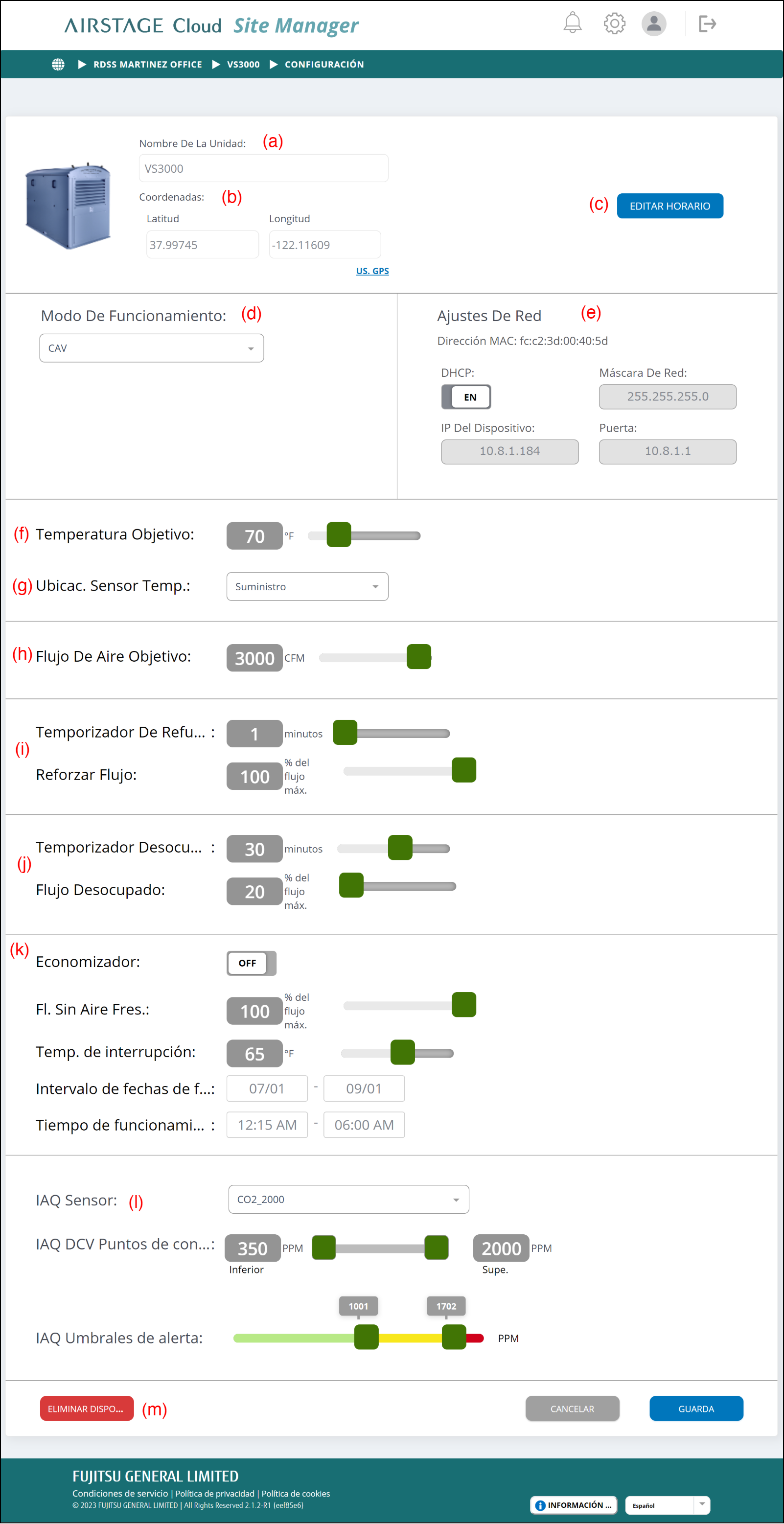 Establece las coordenadas del ventilador. Cuando se establecen las coordenadas, se muestran en el mapa del panel de control del sitio.