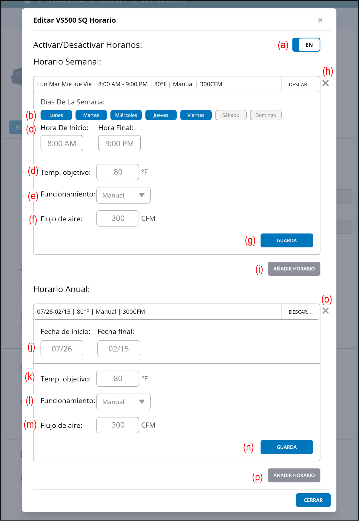 Haga clic en el botón [EDITAR HORARIO] en la configuración del ventilador.