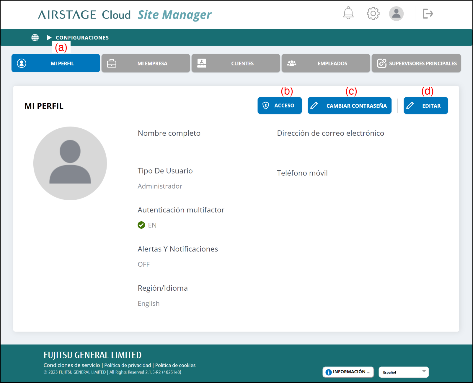 | (c) | Botón [CAMBIAR CONTRASEÑA] | Para cambiar la contraseña, seleccione el botón. Consulte “Cambie su contraseña” para más detalles. |