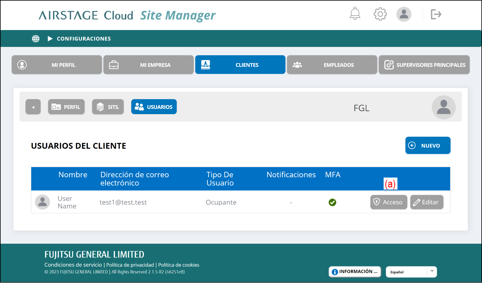 - Seleccione el botón [Acceso] (a) de un usuario cliente en la pantalla “USUARIOS DEL CLIENTE”.