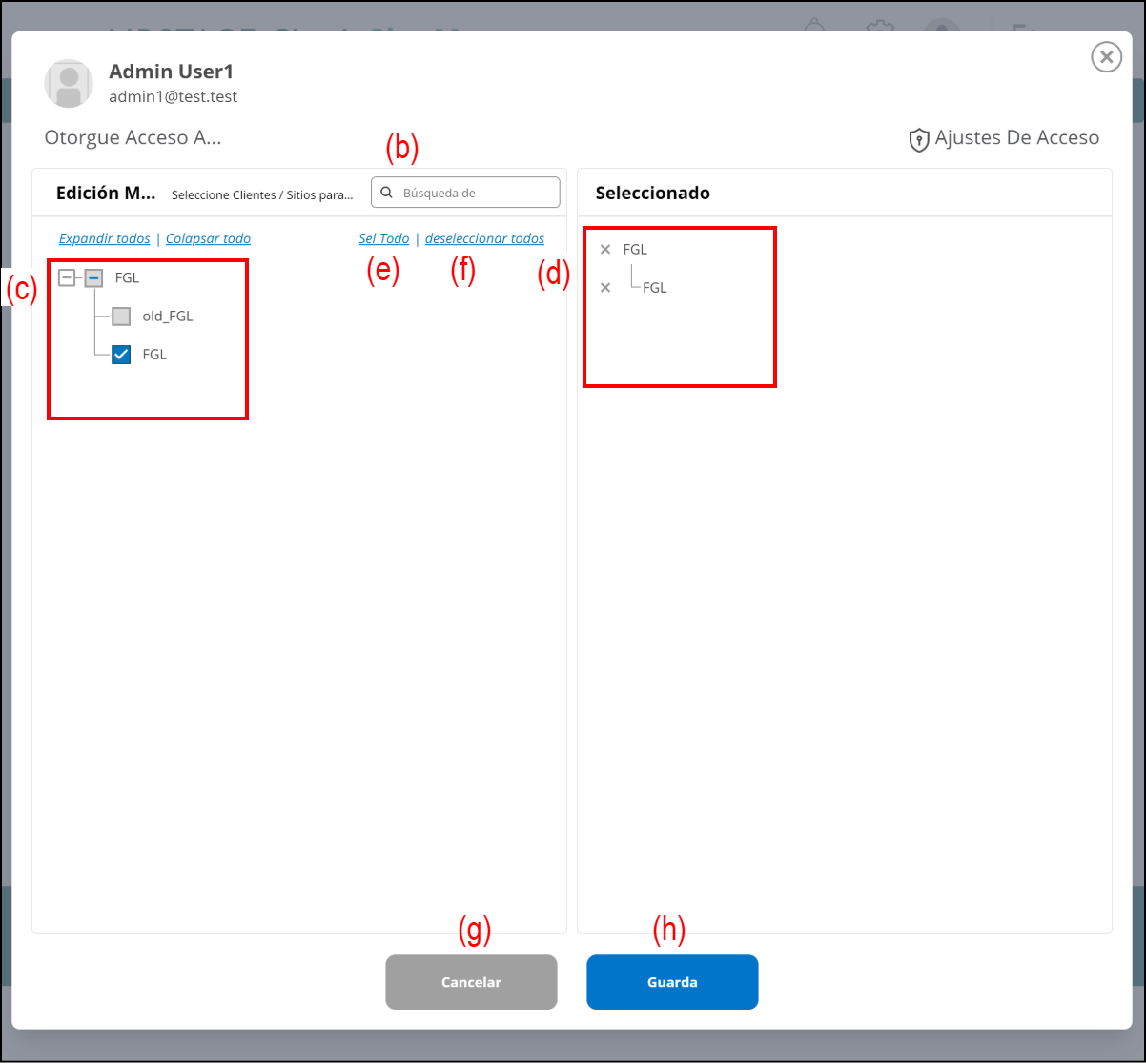 | (e) | [Sel Todo] | Seleccione todos los clientes y sitios. |