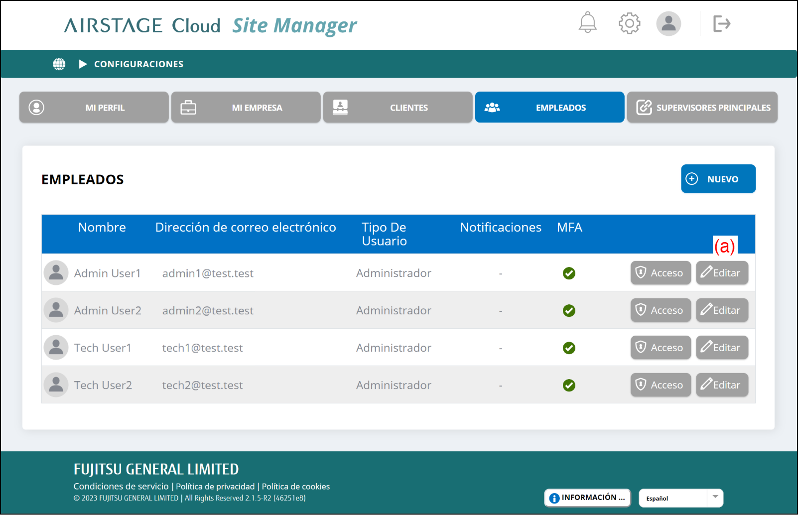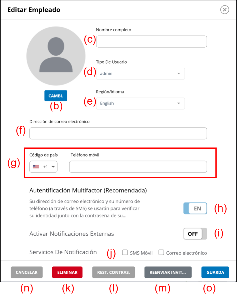 | (h) | Autentificación Multifactor | Active/desactive la autentificación multifactor del empleado. Si está activada, el empleado requiere un código de verificación al iniciar sesión. El código de verificación será enviado por SMS móvil cada vez que inicie sesión. Si el empleado es el administrador, debe estar activada. |