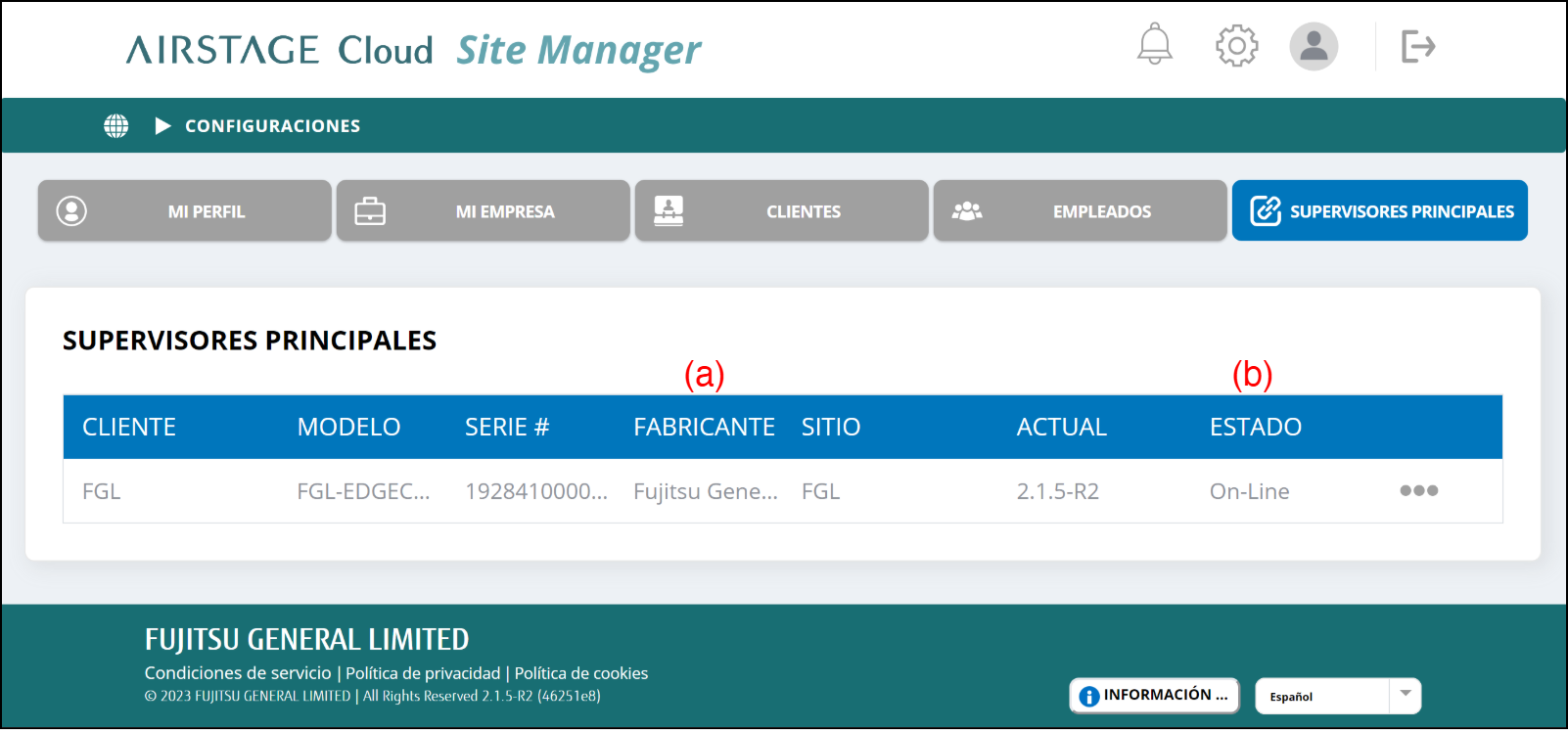 El Supervisor principal está conectado a AIRSTAGE Cloud. |