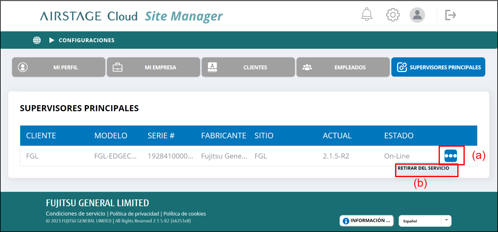 La información del Supervisor principal registrado puede eliminarse de AIRSTAGE Cloud.