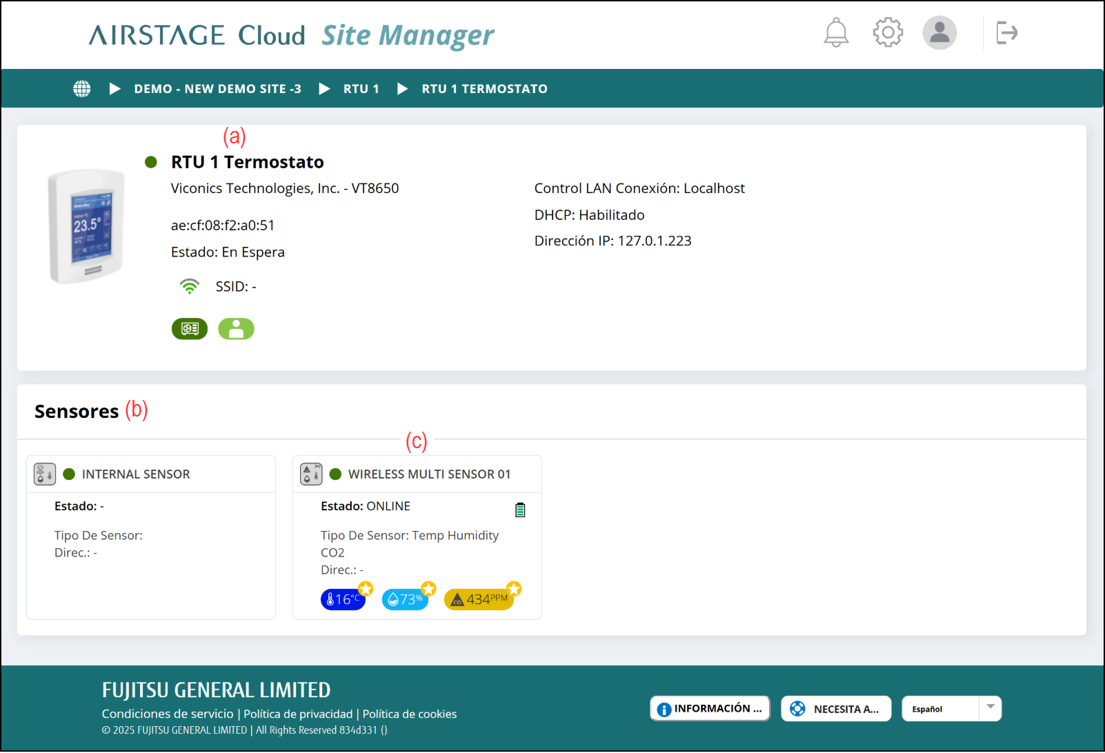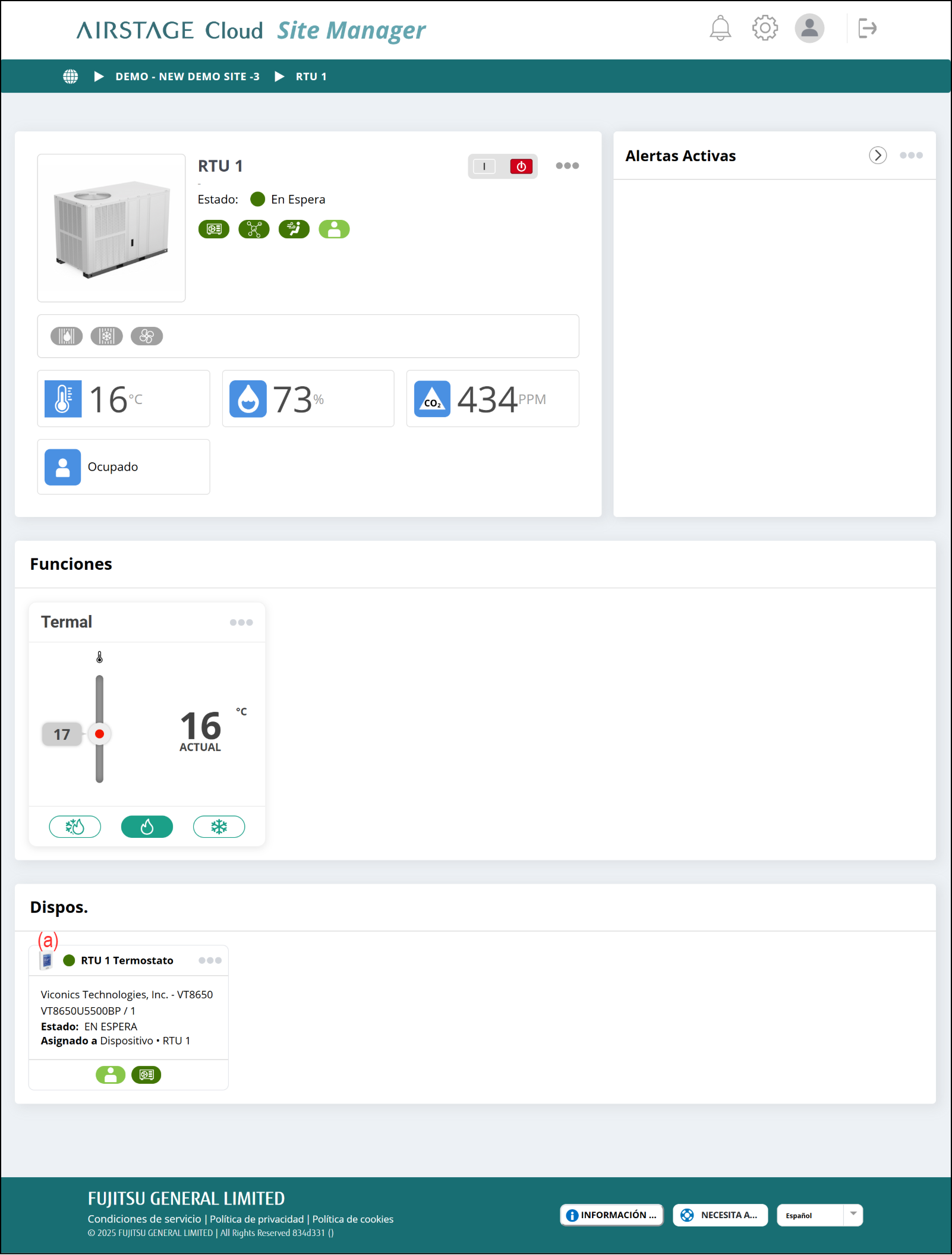 Muestra la información del Termostato inteligente conectado a la Unidad superior del tejado.