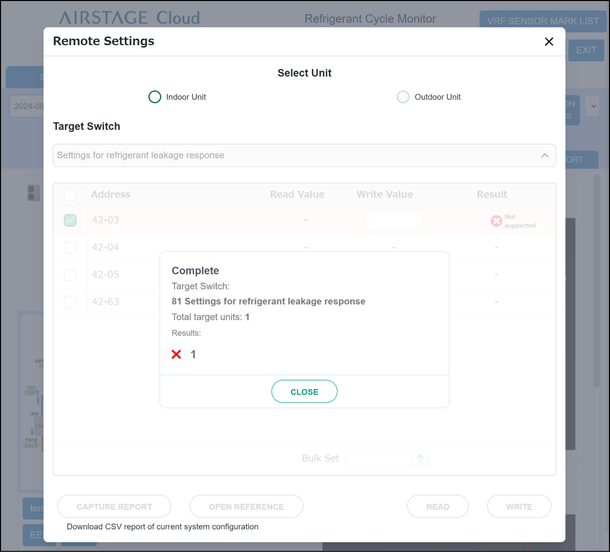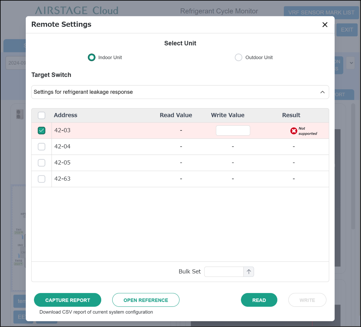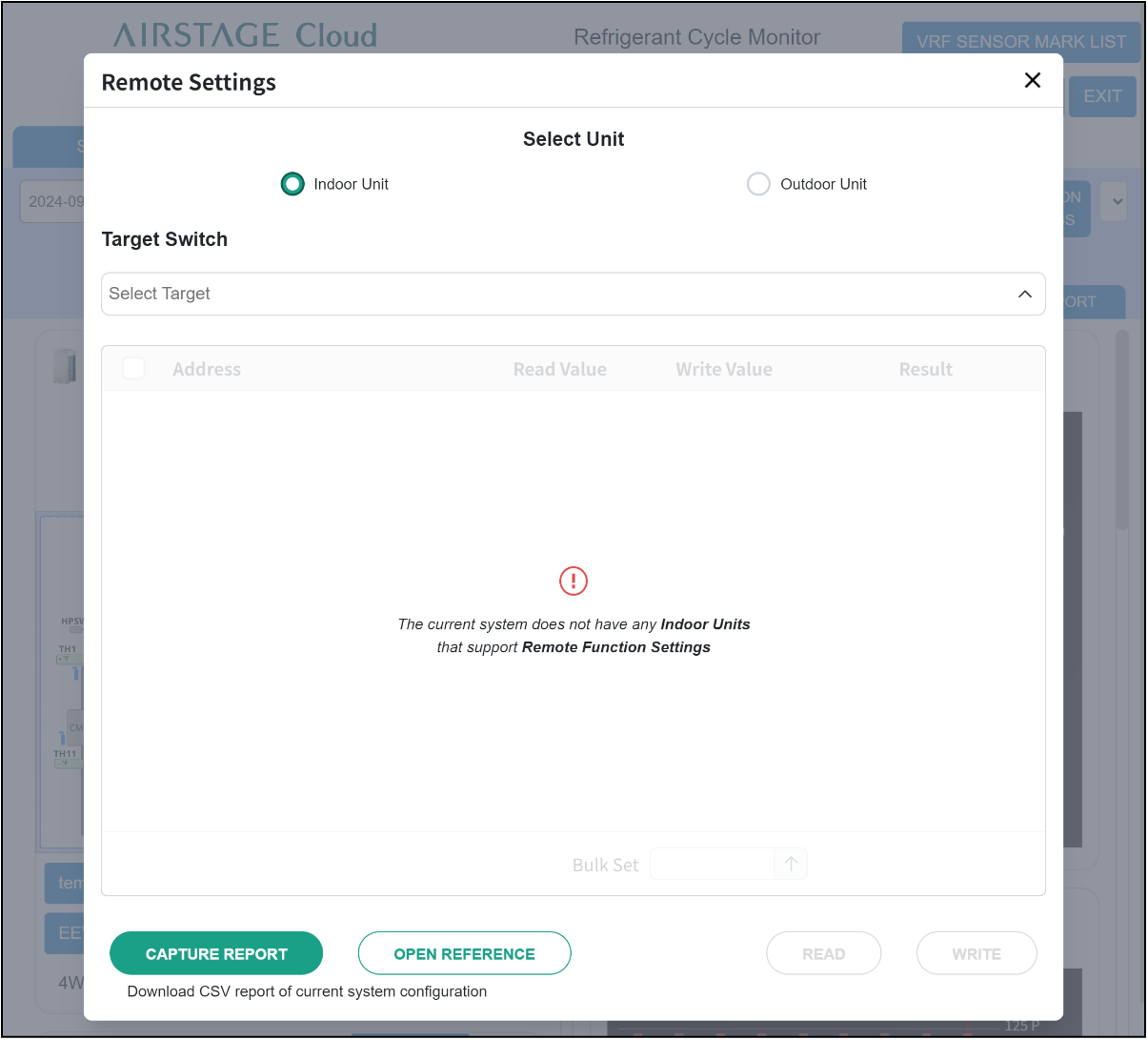 - Pulse el botón “REMOTE SETTINGS” en la pantalla “Refrigerant Cycle Monitor”.