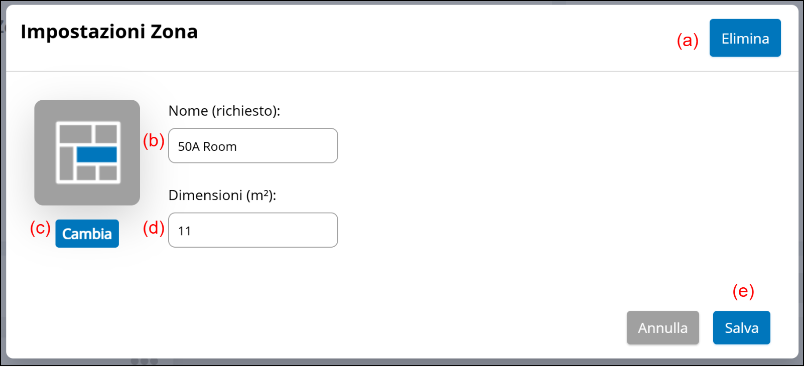 Consente di visualizzare la finestra “Impostazioni Zona”. - Elimina zona
