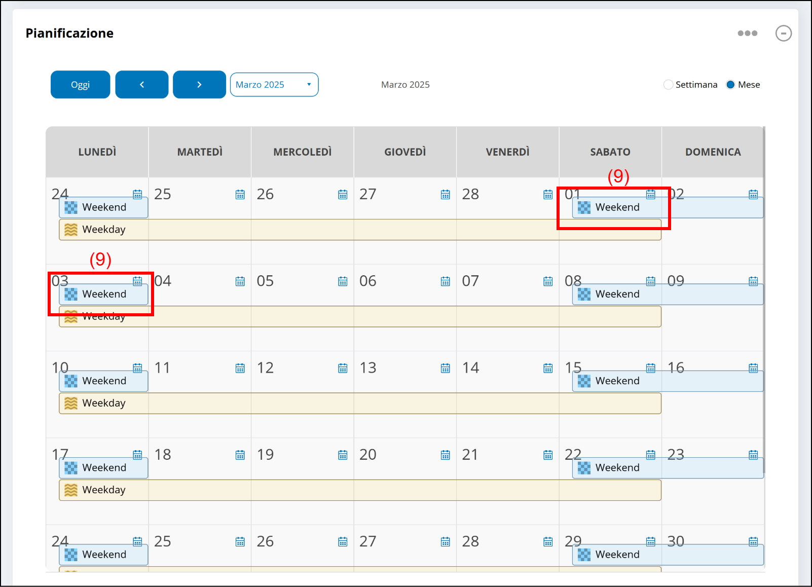 Nell’esempio precedente, in un giorno della settimana, è presente un programma alle 8:00 ogni mattina, dal lunedì al venerdì. Poiché è presente un altro programma alle 8:00 di sabato e di domenica, il programma del giorno della settimana viene visualizzato fino alle 8:00 di sabato. - Per mese