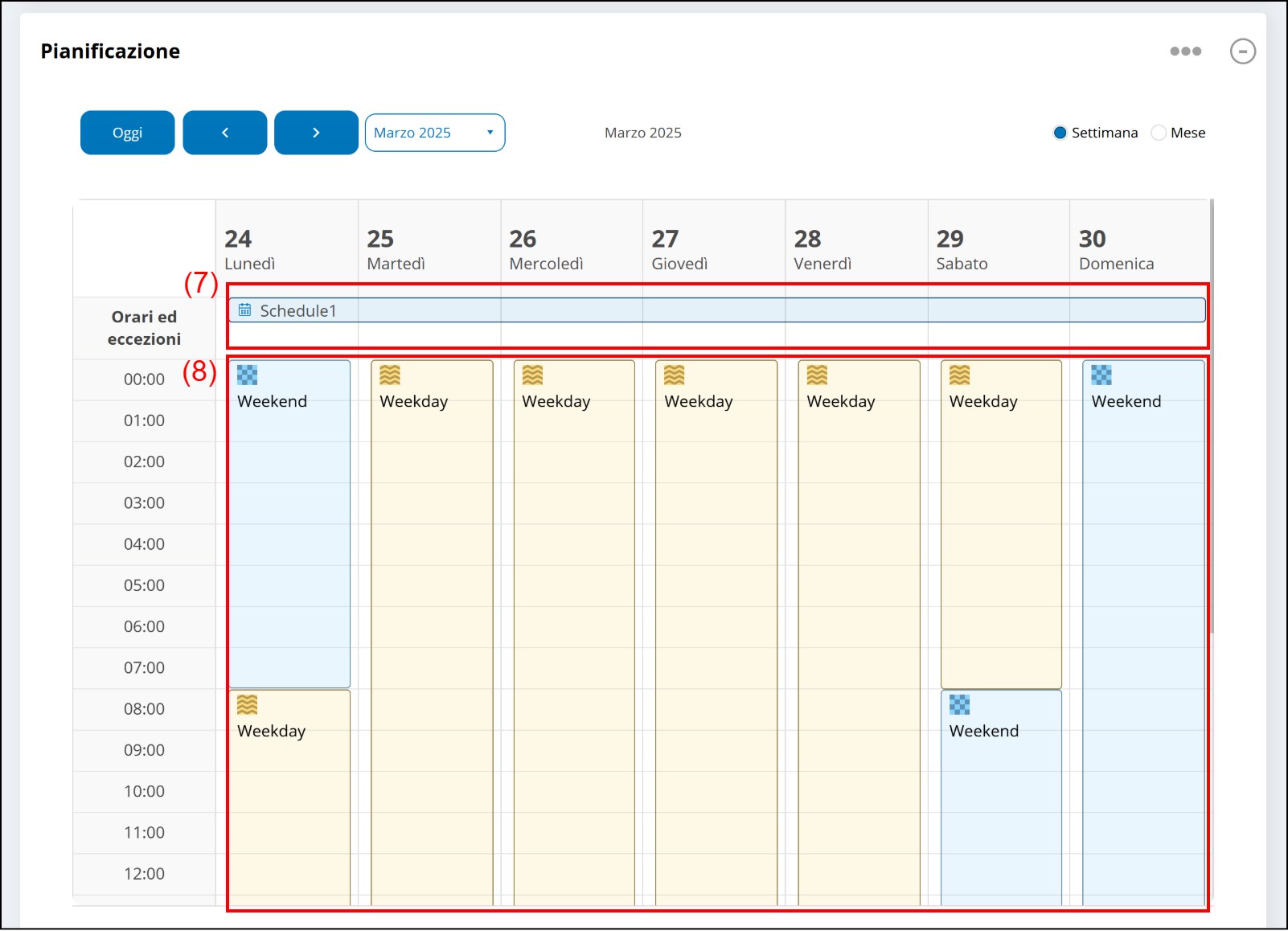 (7) Quando si imposta una programmazione o un’eccezione, vengono visualizzate nella parte superiore della schermata.