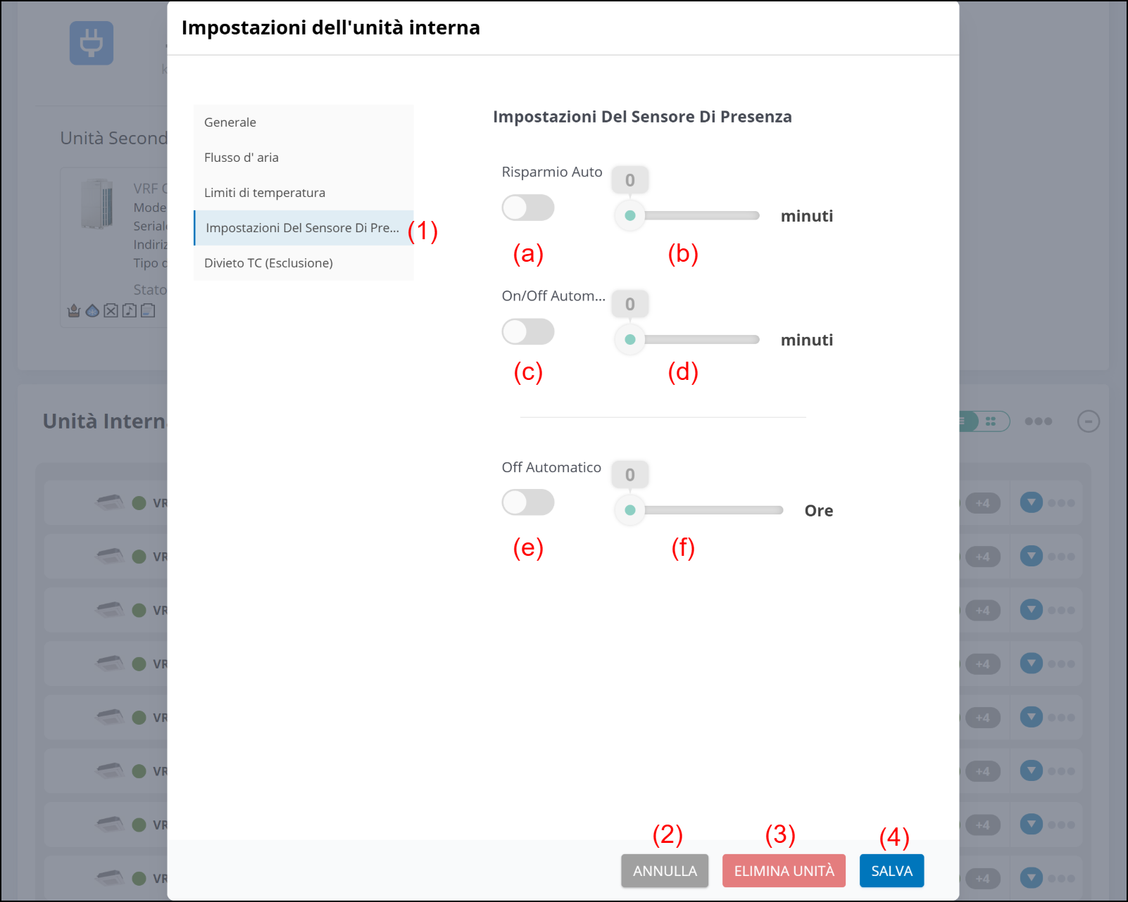 La modifica delle impostazioni o la rimozione possono essere eseguite per l’unità interna.