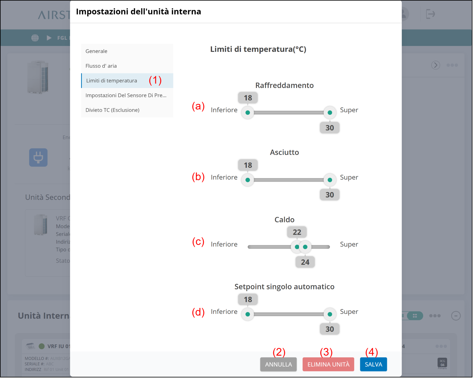 Finestra “Impostazioni dell'unità interna” (Limiti di temperatura)