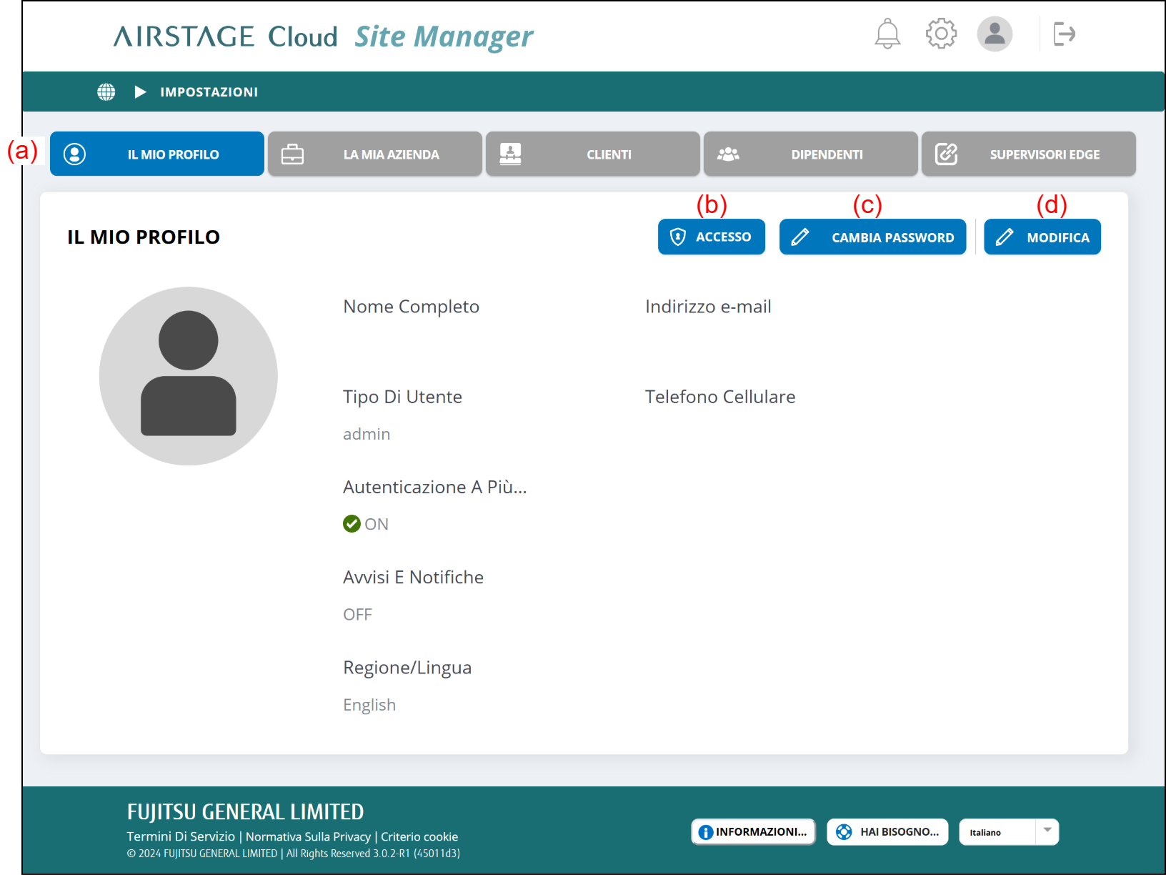 | (d) | Pulsante [MODIFICA] | Per modificare il profilo, selezionare il pulsante. Fare riferimento a “Modifica il profilo” per i dettagli. |