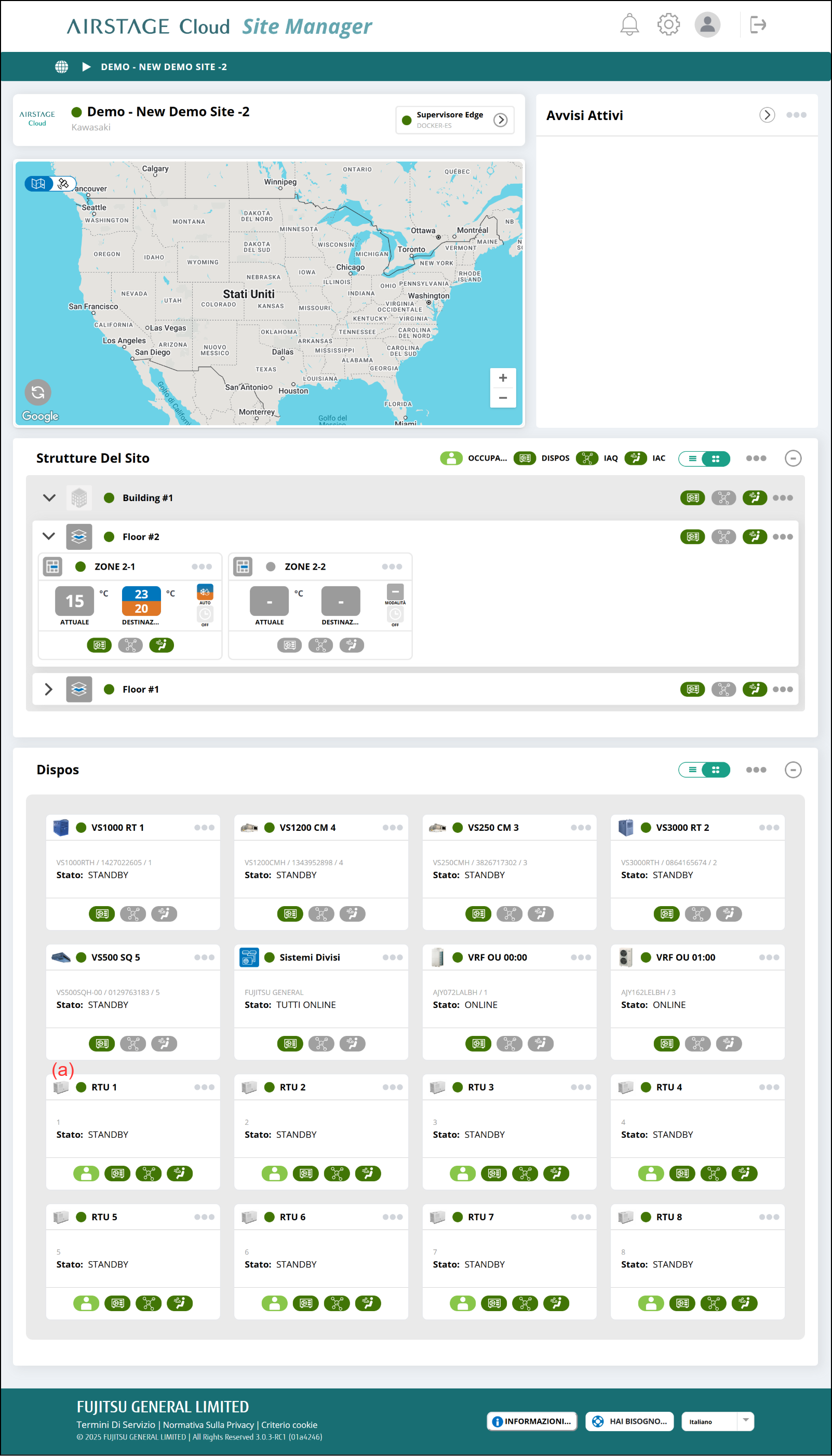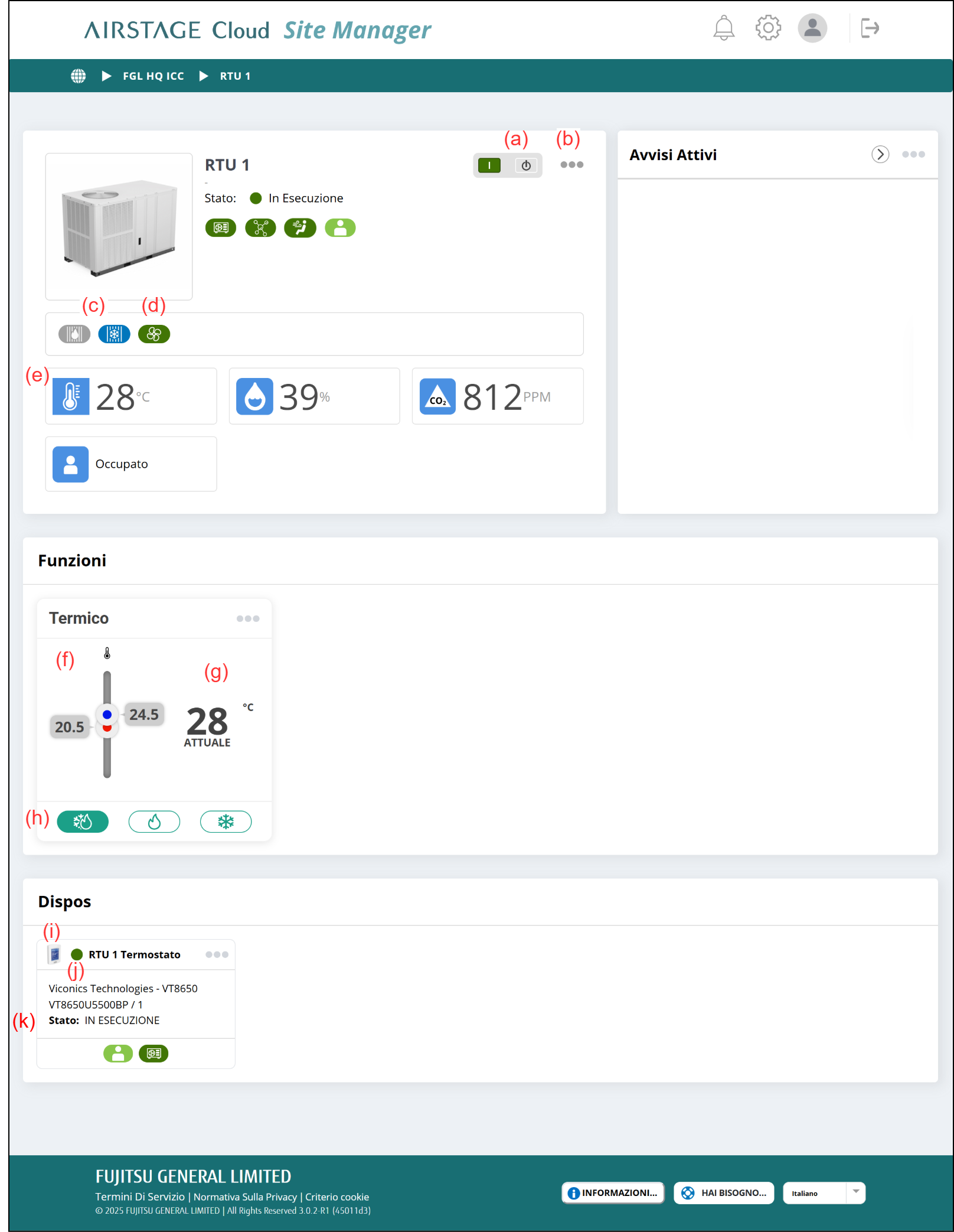 Un avviso viene visualizzato nell’area “Avvisi Attivi” quando le condizioni dell’unità tetto raggiungono un livello di gravità medio o critico.