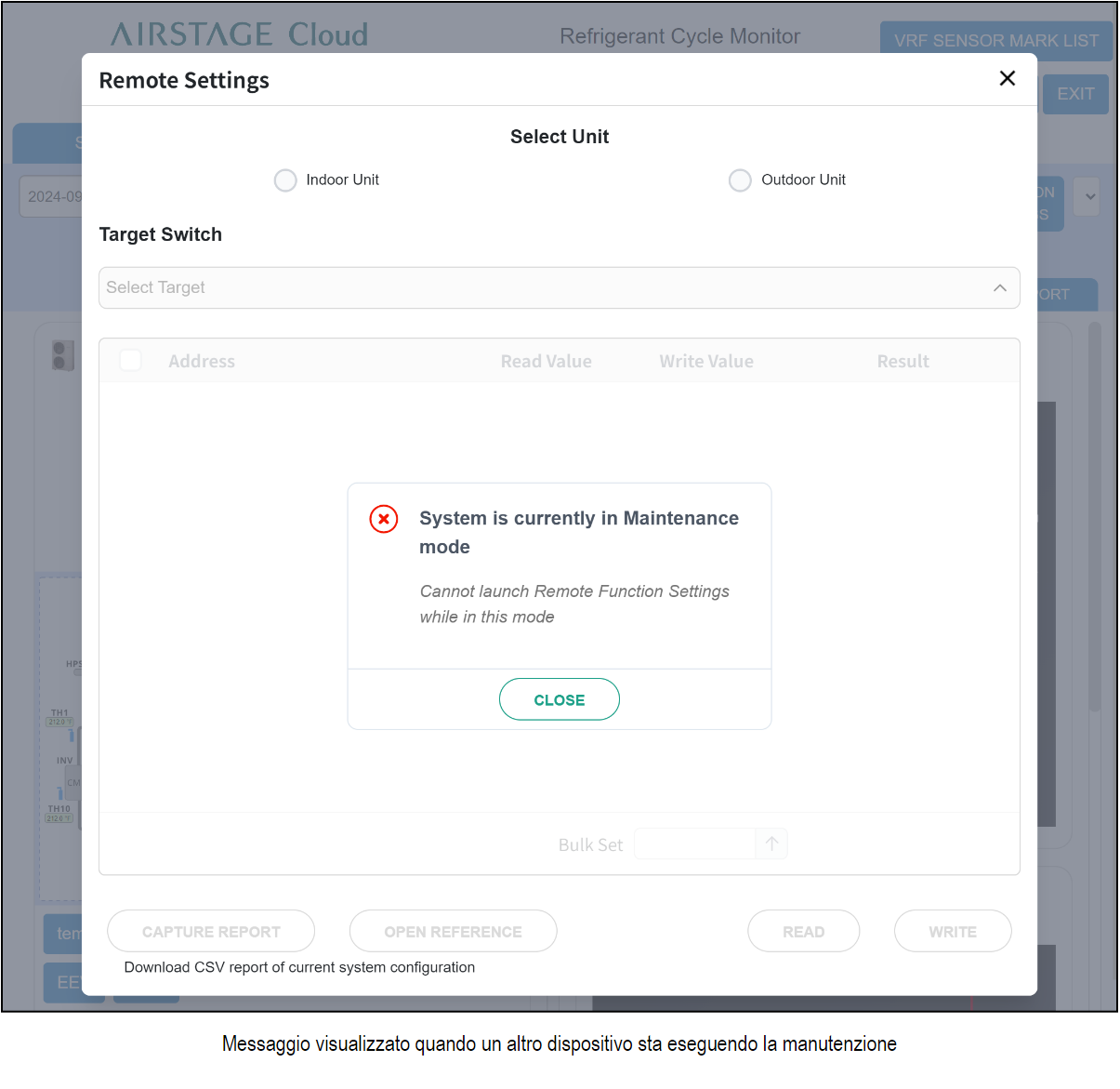 Se il sistema VRF si trova nello stato seguente, non è possibile selezionare né “Indoor Unit” né “Outdoor Unit”. Utilizzare questa funzione dopo aver risolto eventuali problemi