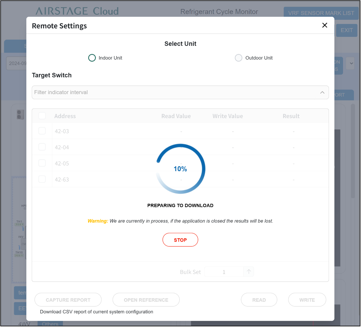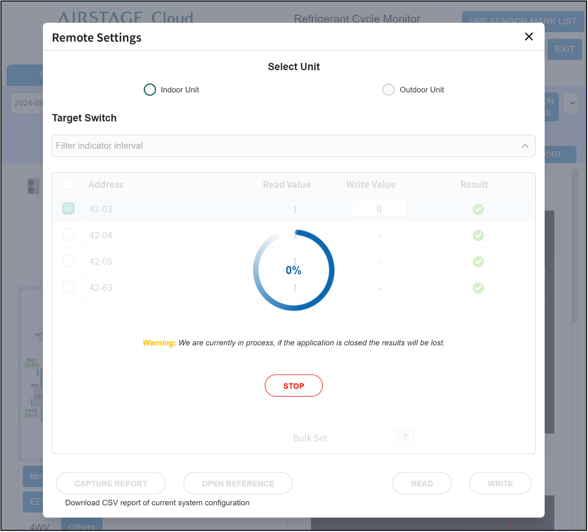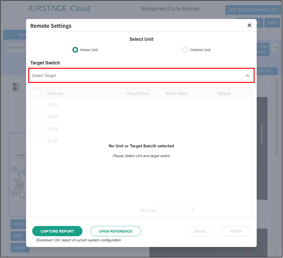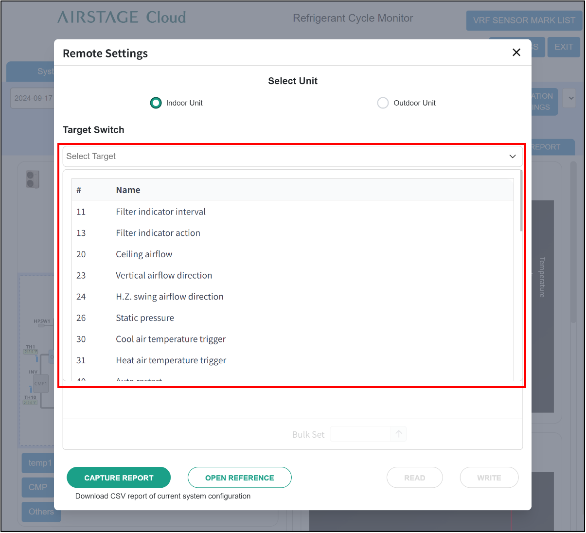- Toccare il pulsante “REMOTE SETTINGS” nella schermata “Refrigerant Cycle Monitor”.