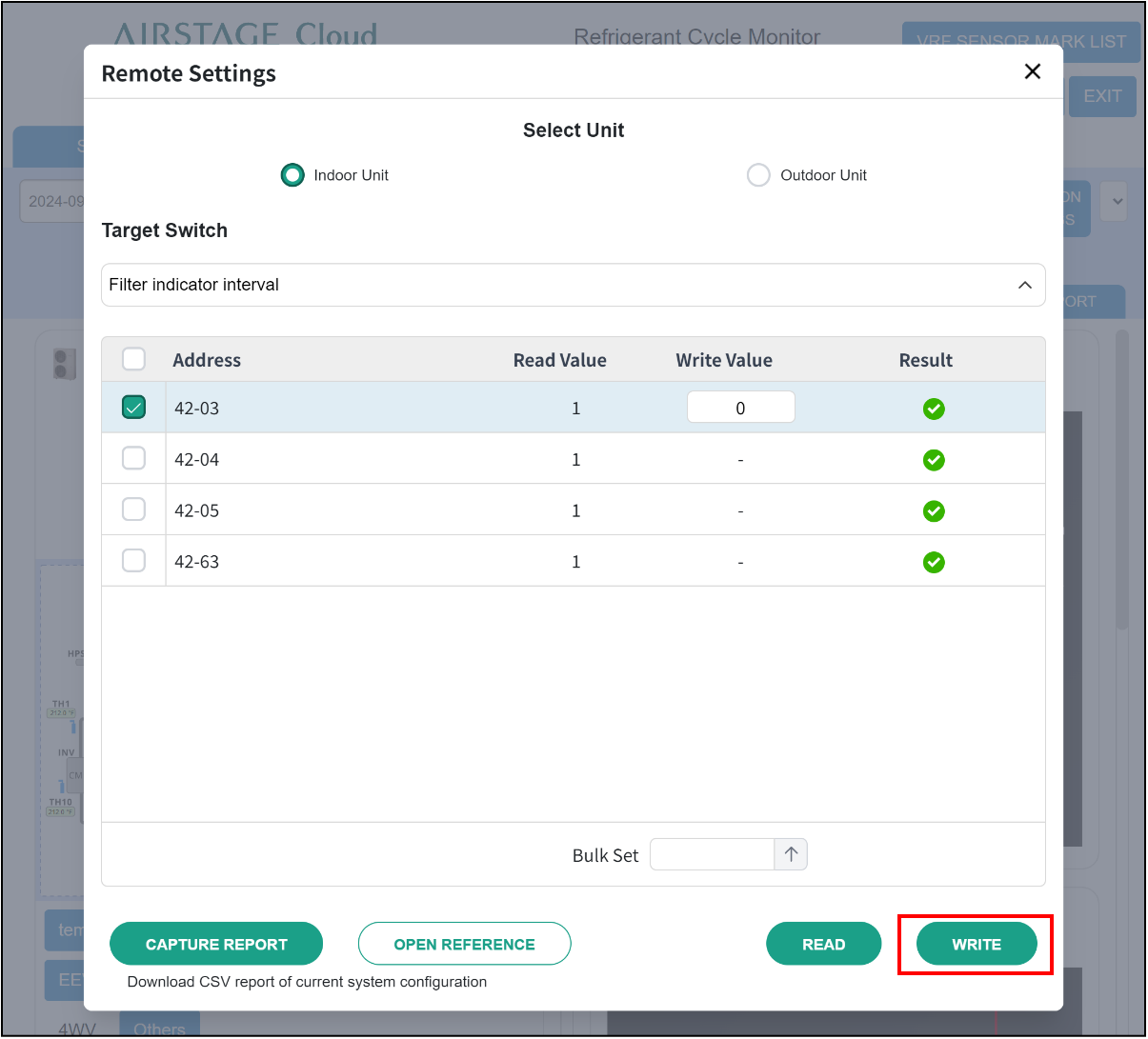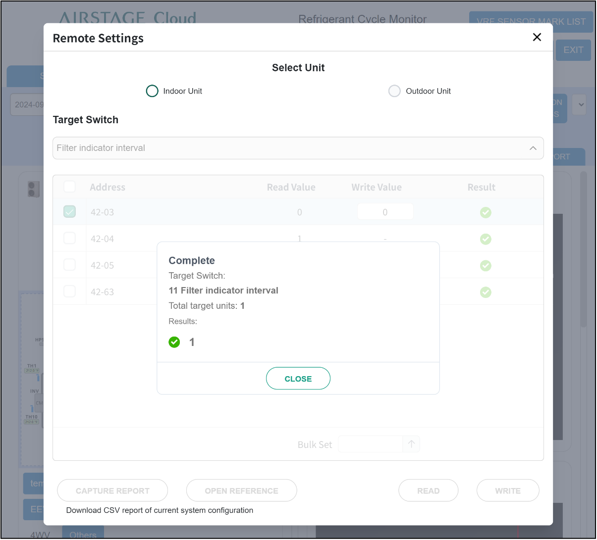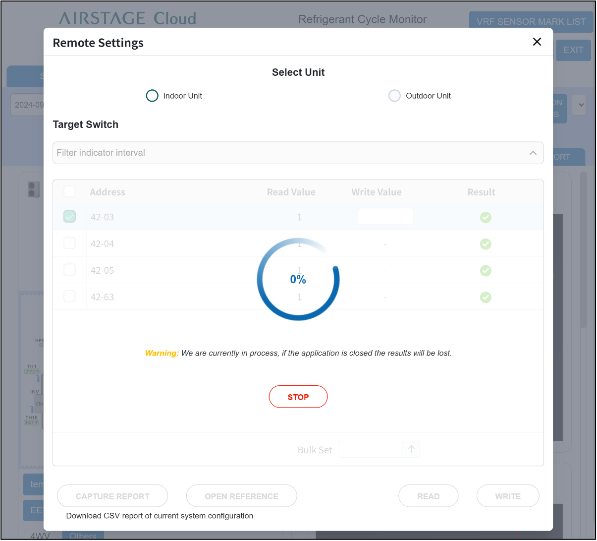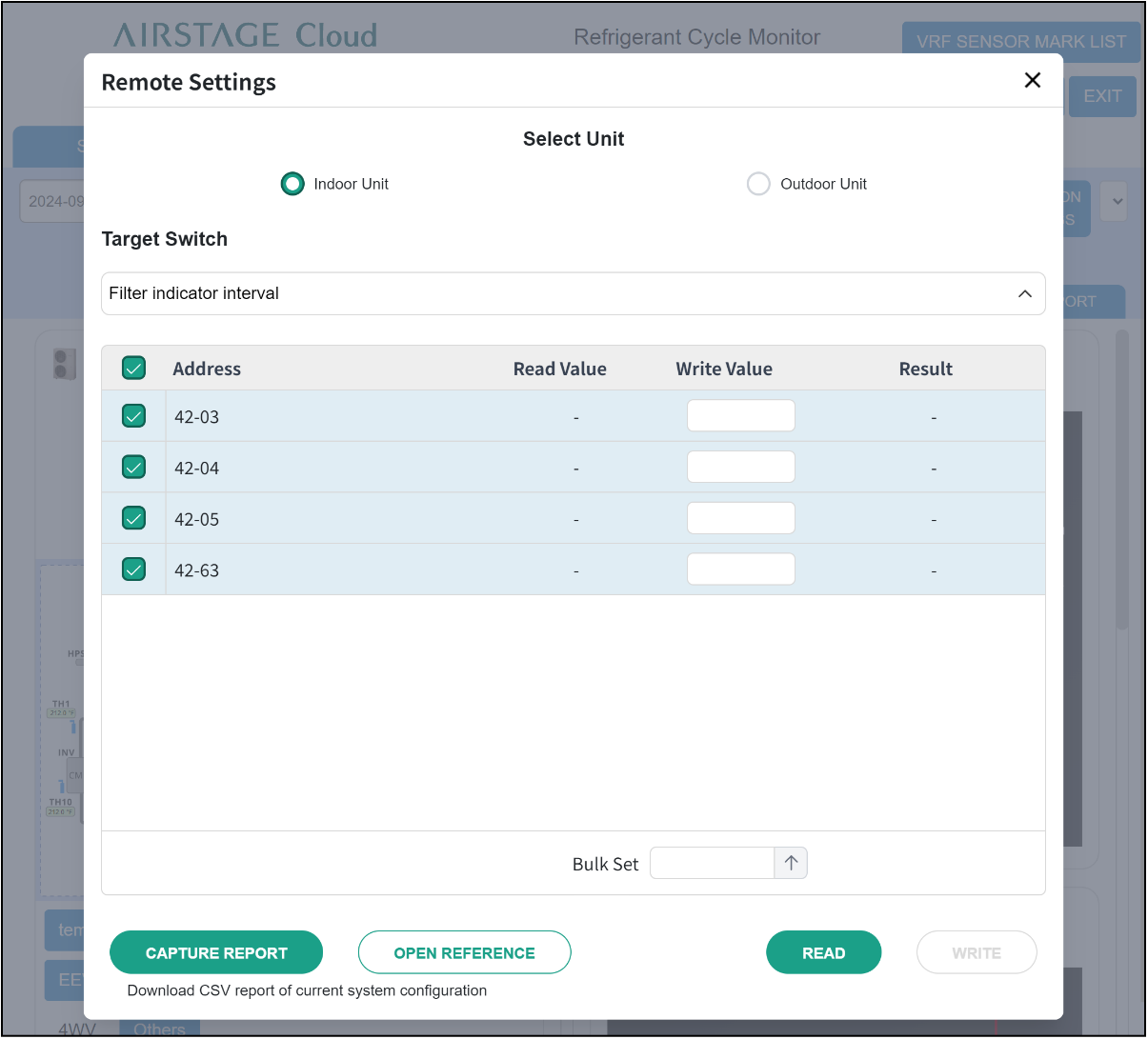 - Toccare il pulsante “REMOTE SETTINGS” nella schermata “Refrigerant Cycle Monitor”.